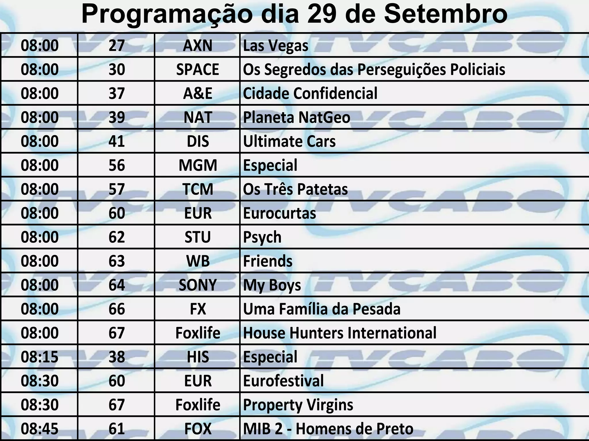 Este documento fornece a programação de canais de TV para 29 de setembro, listando os programas e horários em vários canais como AXN, SPACE, A&E, NATGEO, DISCOVERY e outros. A programação inclui filmes, séries e documentários em diferentes gêneros como ação, drama, comédia e reality shows.