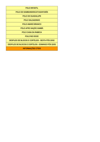 O documento apresenta a programação de blocos e cortejos de carnaval em Olinda entre os dias 31 de janeiro a 22 de fevereiro, incluindo desfiles, bailes, encontros de maracatus, afoxés e bois. Também lista informações sobre os polos de carnaval e horários das agremiações.