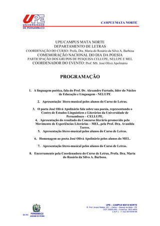 O documento descreve a programação de um evento no Campus Mata Norte da UPE para comemorar o Dia da Poesia. A programação inclui palestras sobre a linguagem poética e a obra do poeta José Olivá Apolinário, apresentações literomusicais de alunos e a premiação de um concurso literário.