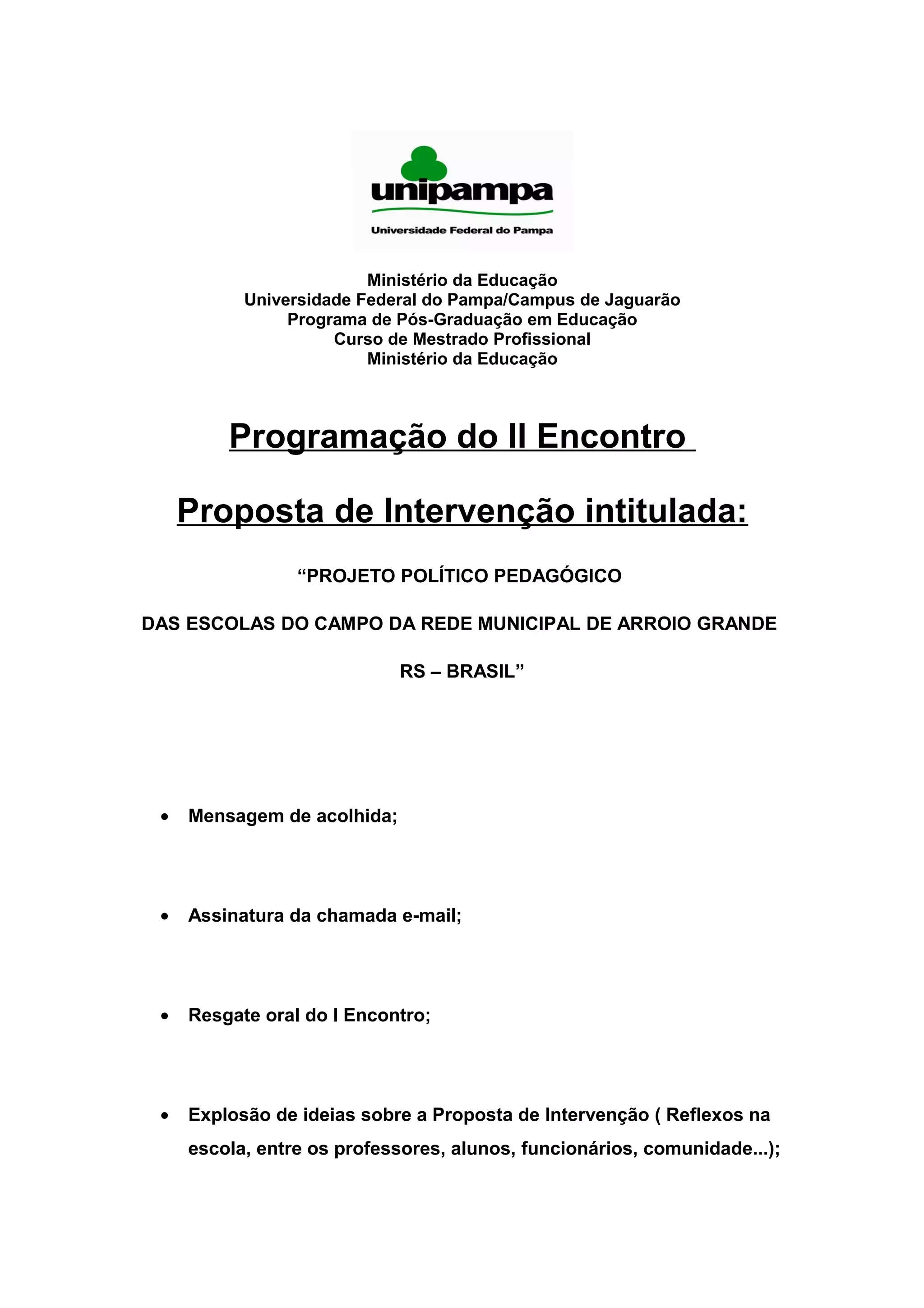 O documento descreve a programação do II Encontro de um Programa de Pós-Graduação em Educação sobre a proposta de intervenção "Projeto Político Pedagógico das Escolas do Campo da Rede Municipal de Arroio Grande RS - Brasil". A programação inclui boas-vindas, discussões sobre a proposta de intervenção, comentários sobre avanços nas escolas e palestras sobre educação no campo.