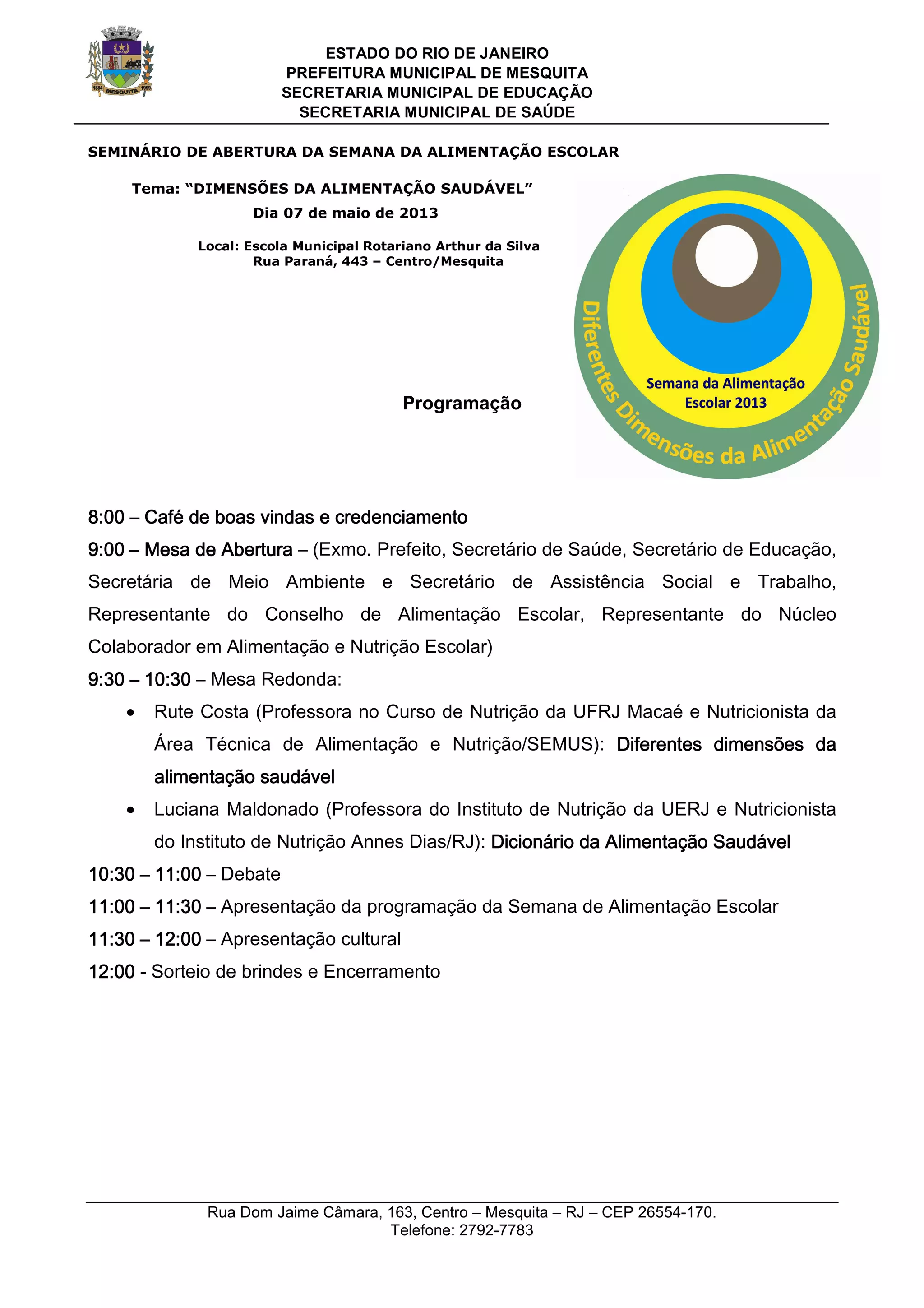 O documento anuncia um seminário sobre alimentação saudável na Escola Municipal Rotariano Arthur da Silva em Mesquita, Rio de Janeiro. A programação inclui uma mesa de abertura com autoridades locais, uma mesa redonda com duas professoras sobre dimensões da alimentação saudável e dicionário da alimentação saudável, um debate, apresentação da programação da Semana de Alimentação Escolar e encerramento com apresentação cultural e sorteio de brindes.
