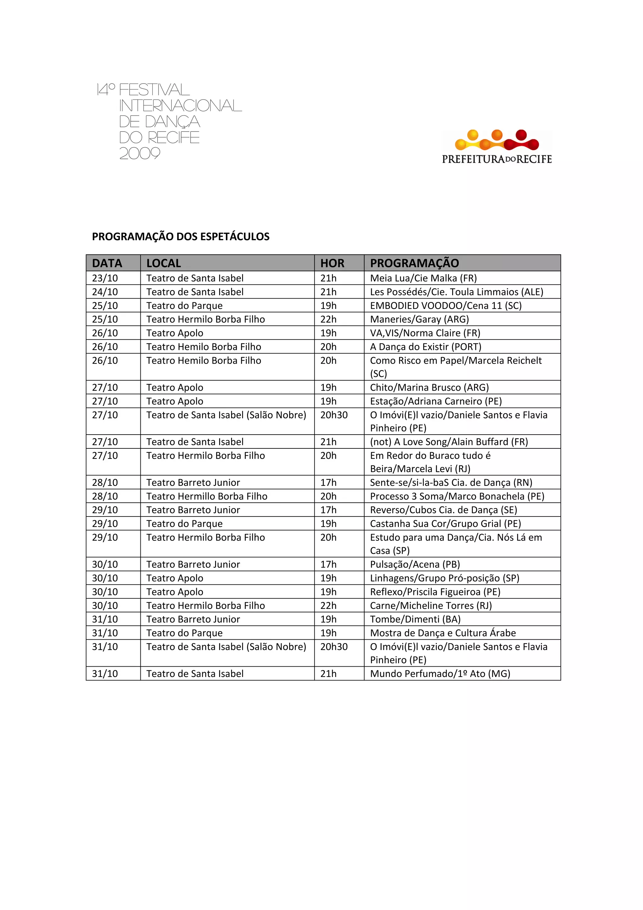 Este documento apresenta a programação de espetáculos de dança que ocorrerão entre os dias 23 e 31 de outubro em diversos teatros. A programação inclui o nome do espetáculo, companhia e local/data/horário de cada apresentação. Haverá espetáculos de diversos países como França, Alemanha e Argentina, além de vários estados brasileiros como Pernambuco, Rio de Janeiro e São Paulo.