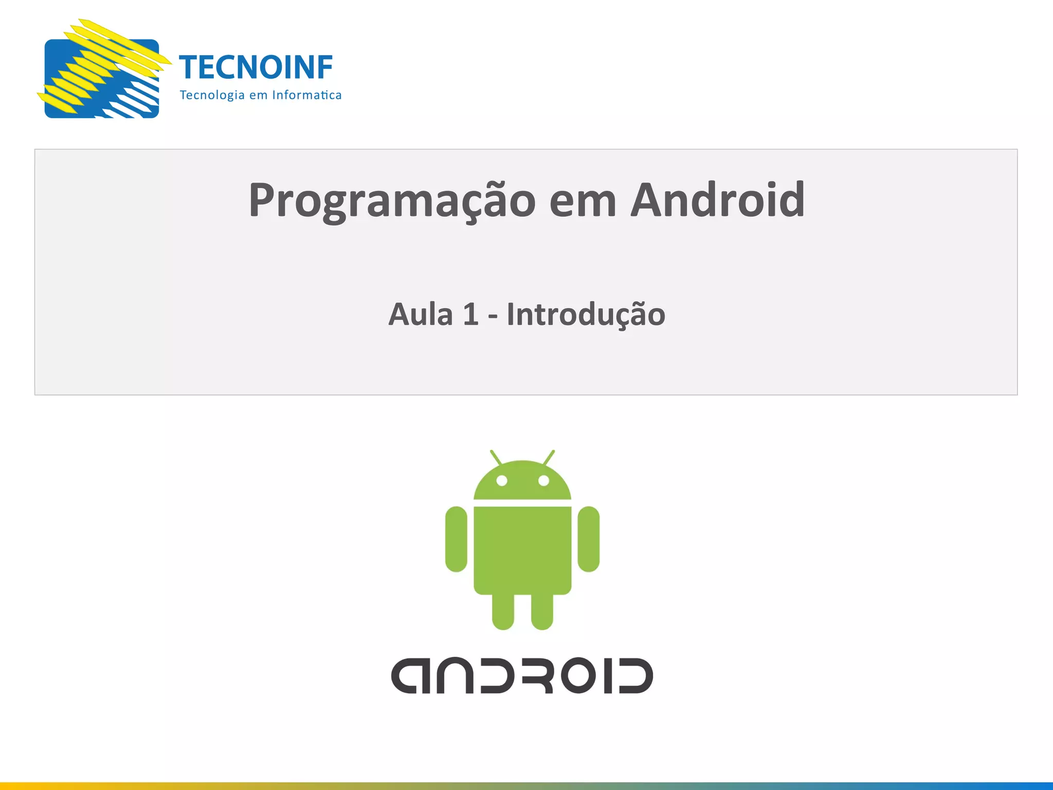 O documento fornece uma introdução à plataforma Android, descrevendo seu sistema operacional baseado no Linux, o SDK para desenvolvimento de aplicativos usando Java, e a Open Handset Alliance responsável por seu desenvolvimento. Também resume os principais componentes da arquitetura Android como framework, bibliotecas, runtime e kernel Linux.