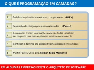Este documento discute programação em camadas para iniciantes. Ele explica que camadas dividem uma aplicação em módulos com responsabilidades separadas que se comunicam entre si. Algumas camadas computacionais comuns incluem apresentação, aplicação e dados. A programação em camadas traz benefícios como melhor organização, manutenção, reutilização de código e desenvolvimento em equipe.