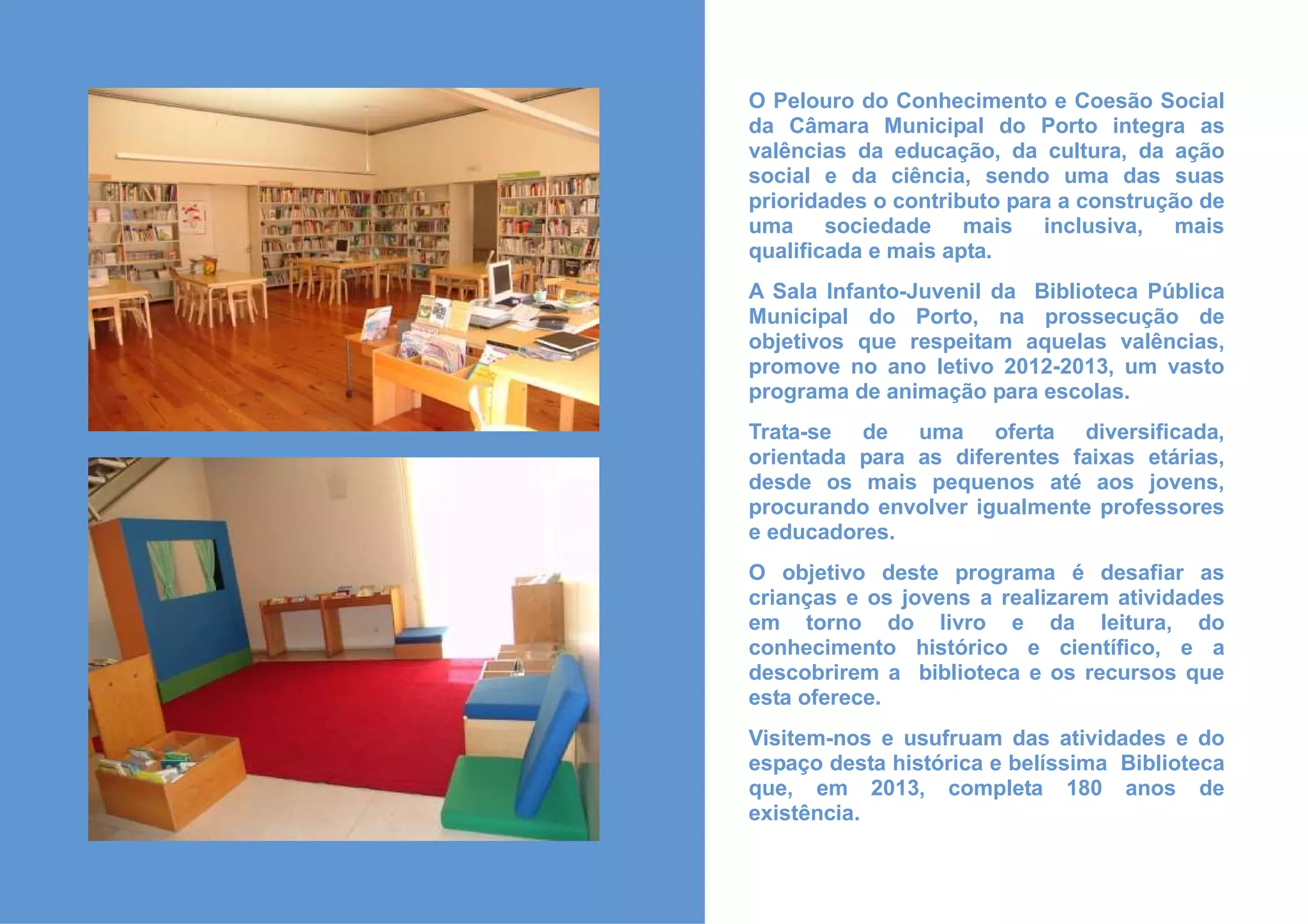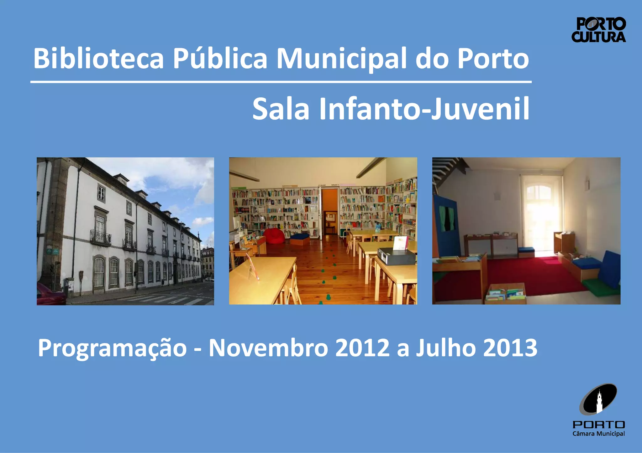 Este documento fornece o programa de atividades para escolas da Biblioteca Pública Municipal do Porto entre novembro de 2012 e julho de 2013, incluindo oficinas, visitas guiadas, jogos e outras atividades para diferentes idades com foco na leitura, literatura e patrimônio cultural.