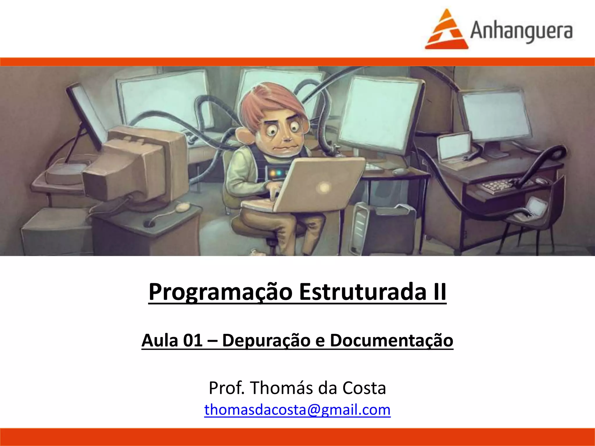 O documento apresenta uma aula sobre depuração e documentação de programas. O professor Thomás da Costa introduz os conceitos de depuração, como depurar erros passo a passo, utilizando ferramentas como breakpoints. Ele também explica a importância da documentação de códigos através de comentários para facilitar a manutenção por outros desenvolvedores.