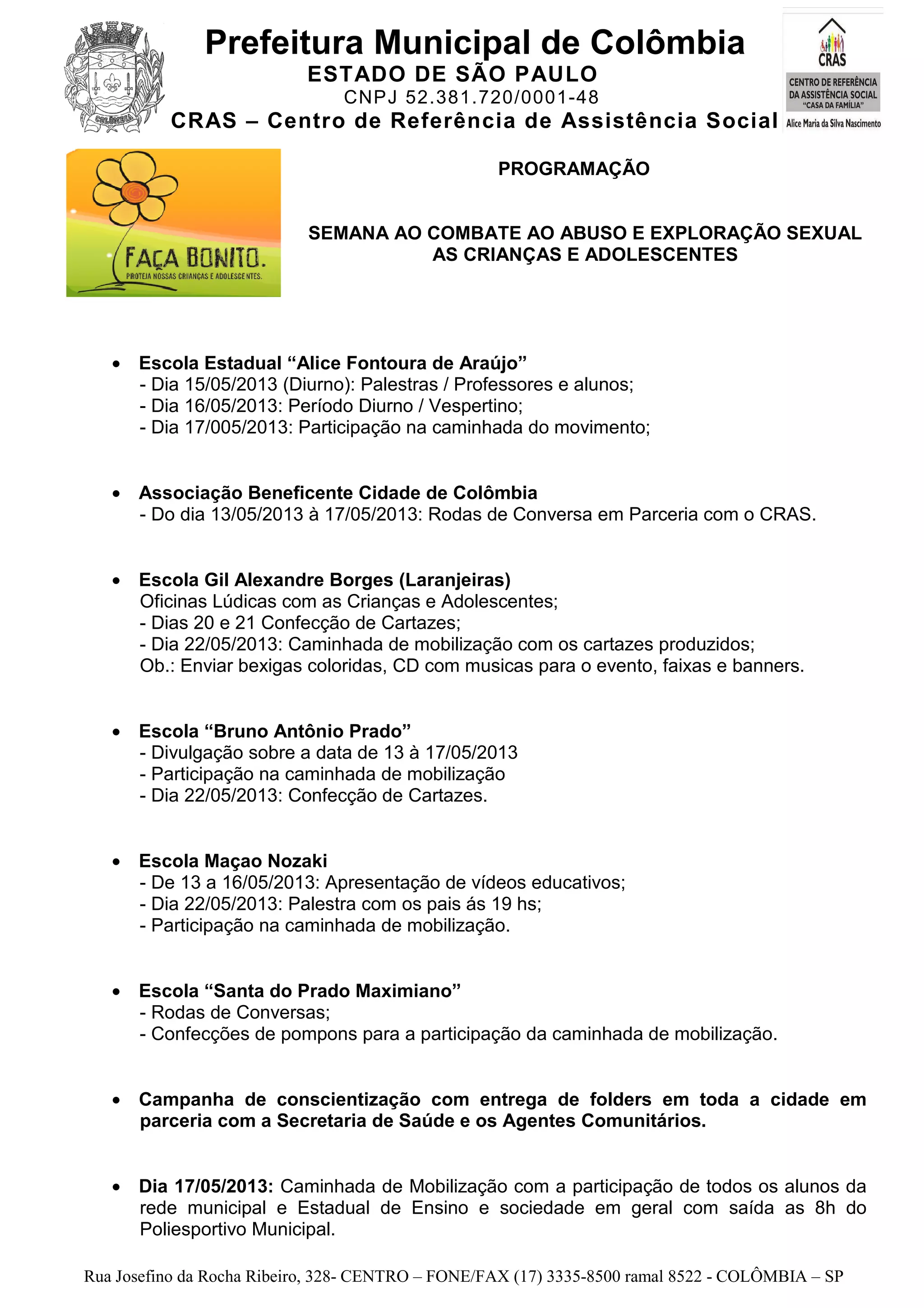 O documento descreve a programação de uma semana de combate ao abuso e exploração sexual de crianças e adolescentes em Colômbia, São Paulo. A programação inclui palestras, oficinas, vídeos educativos, rodas de conversa e uma caminhada de mobilização em 17 de maio com a participação de escolas municipais e estaduais.