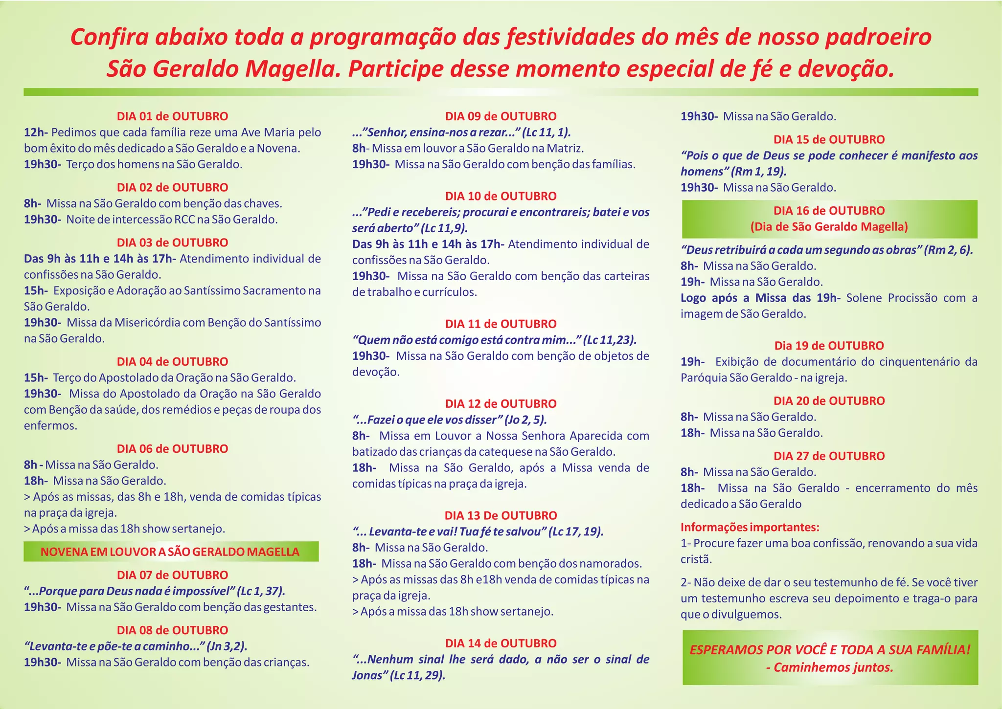 Este documento lista as atividades e missas que ocorrerão durante o mês de outubro em homenagem a São Geraldo Magella, padroeiro da paróquia. Inclui datas de missas diárias, novenas, procissões, shows, confissões e venda de comidas típicas para arrecadar fundos. Pede aos fiéis que participem ativamente das celebrações para fortalecer sua fé em São Geraldo.