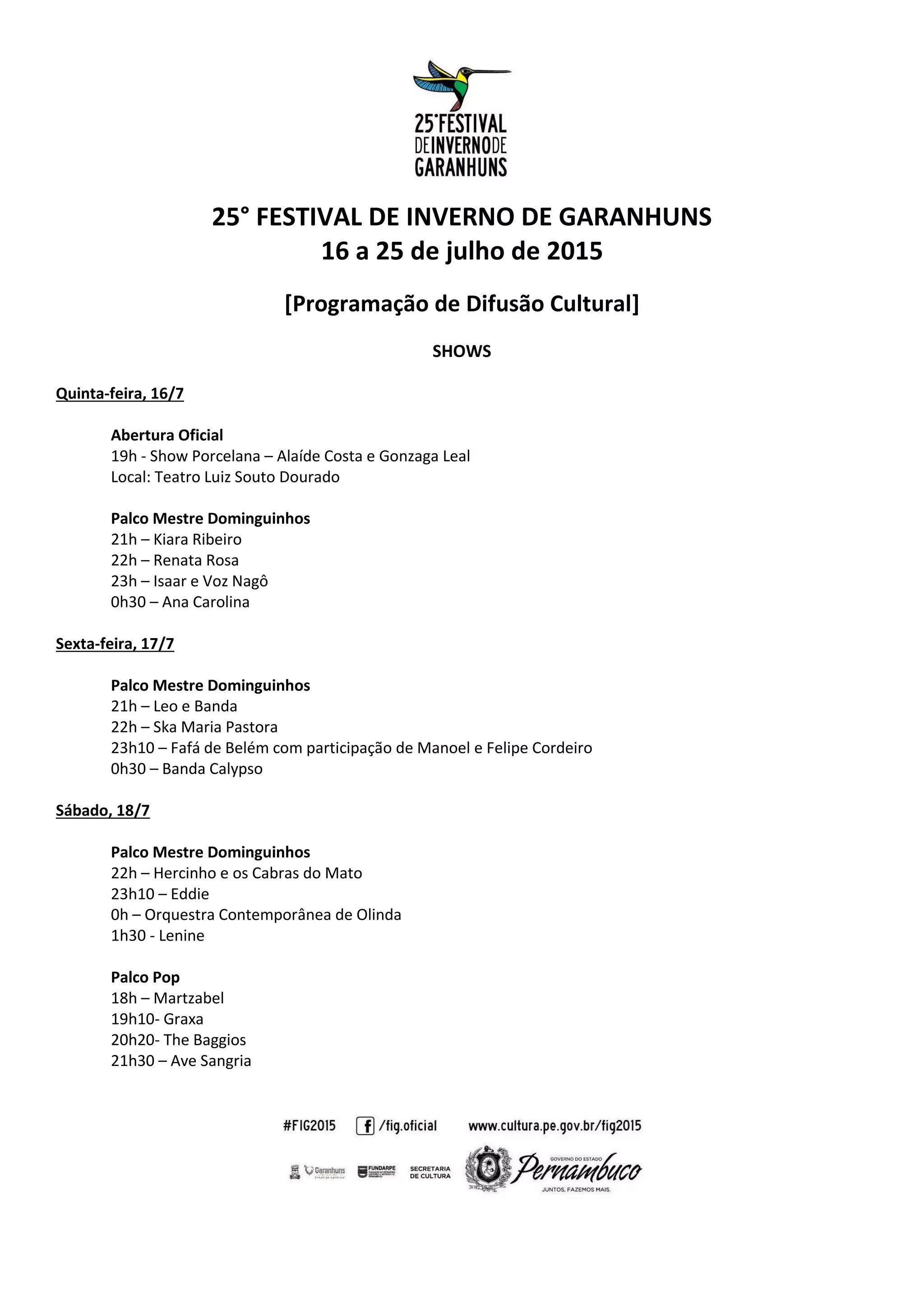 O documento apresenta a programação cultural do 25° Festival de Inverno de Garanhuns, com shows musicais, apresentações de dança, teatro e circo entre os dias 16 a 25 de julho de 2015. Destaca-se a presença de grandes nomes da música brasileira como Fafá de Belém, Lenine, Pitty, Racionais MC's e Capital Inicial.