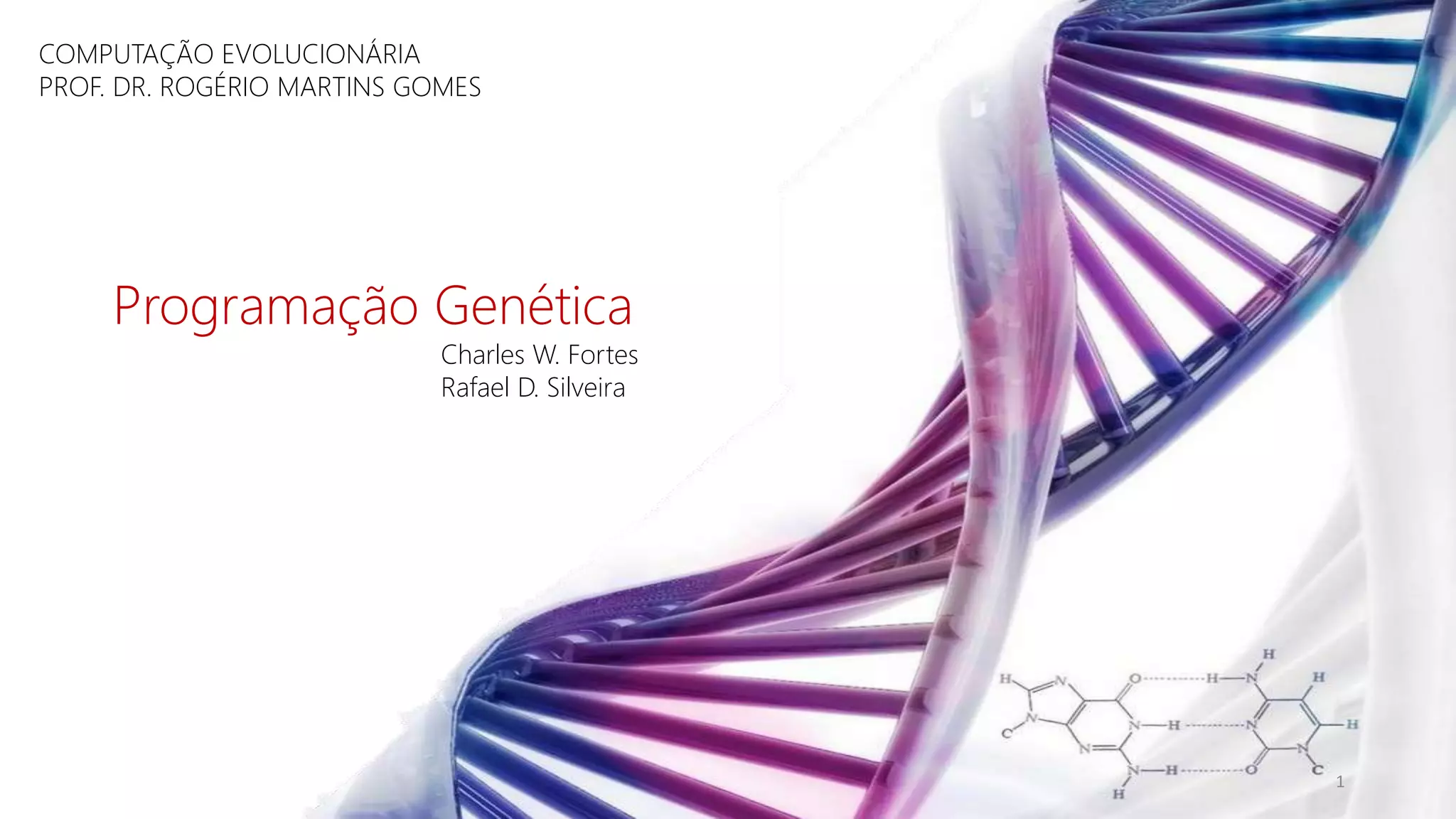 A programação genética é uma técnica de computação evolutiva que gera programas de computador aleatoriamente para solucionar problemas. Os programas são representados como árvores e submetem-se a operações como crossover e mutação para evoluir soluções melhores ao longo das gerações. A técnica é aplicada no exemplo da evolução da pintura Mona Lisa para ilustrar o processo.