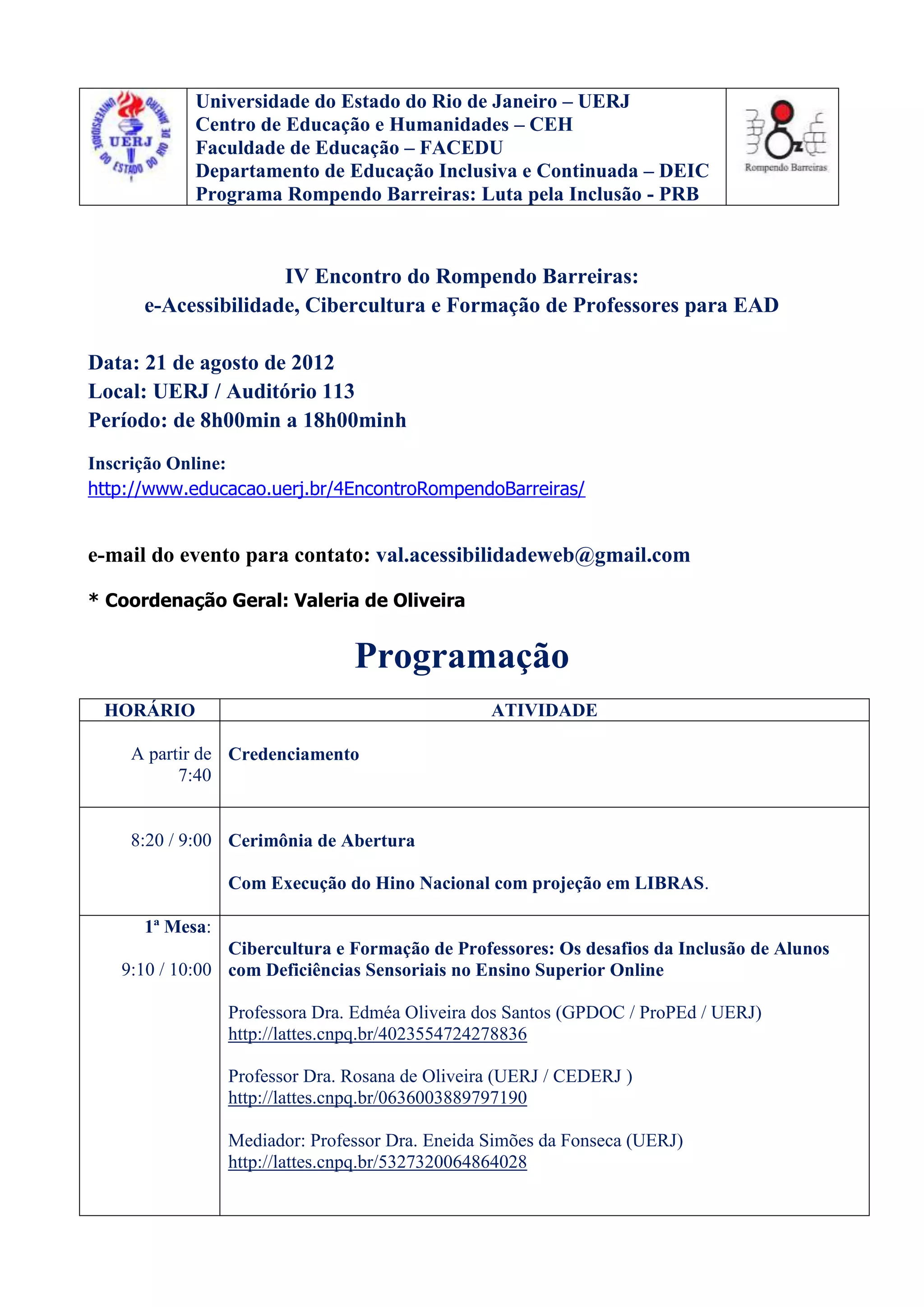 O documento descreve o programa do IV Encontro do Rompendo Barreiras sobre e-Acessibilidade, Cibercultura e Formação de Professores para EAD, incluindo quatro mesas redondas sobre esses temas e uma exposição de arte inclusiva. O evento ocorrerá na UERJ em 21 de agosto de 2012, das 8h às 18h.