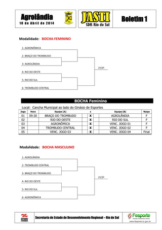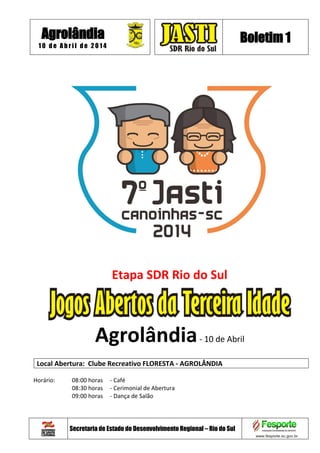 O documento descreve a programação dos jogos da etapa regional de Agrolândia da Secretaria de Estado do Desenvolvimento Regional, incluindo as modalidades, horários, participantes e locais dos jogos de bocha, bolão, canastra, dominó e danças que ocorrerão no dia 10 de abril de 2014.