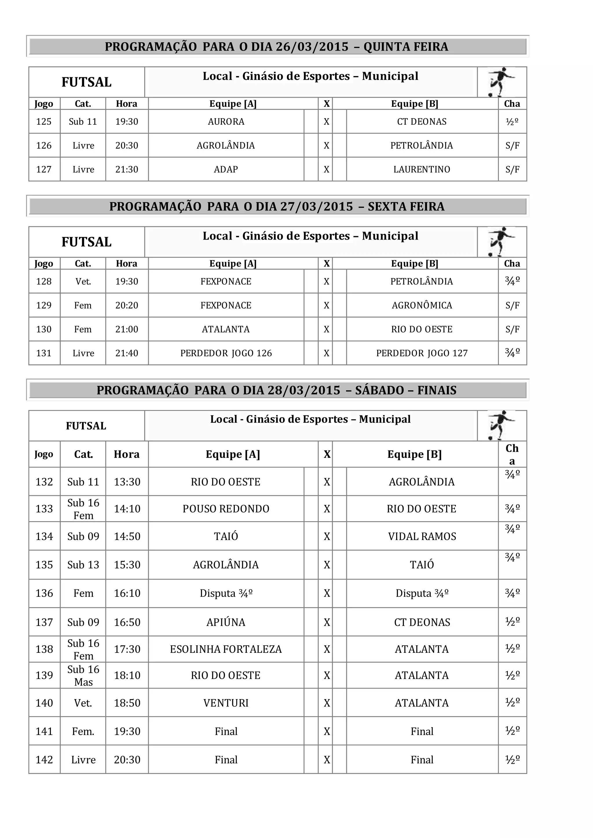 O documento lista as programações de jogos de futsal para três dias, com horários e times envolvidos em cada categoria nos dias 26, 27 e 28 de março, incluindo semifinais e finais no último dia.