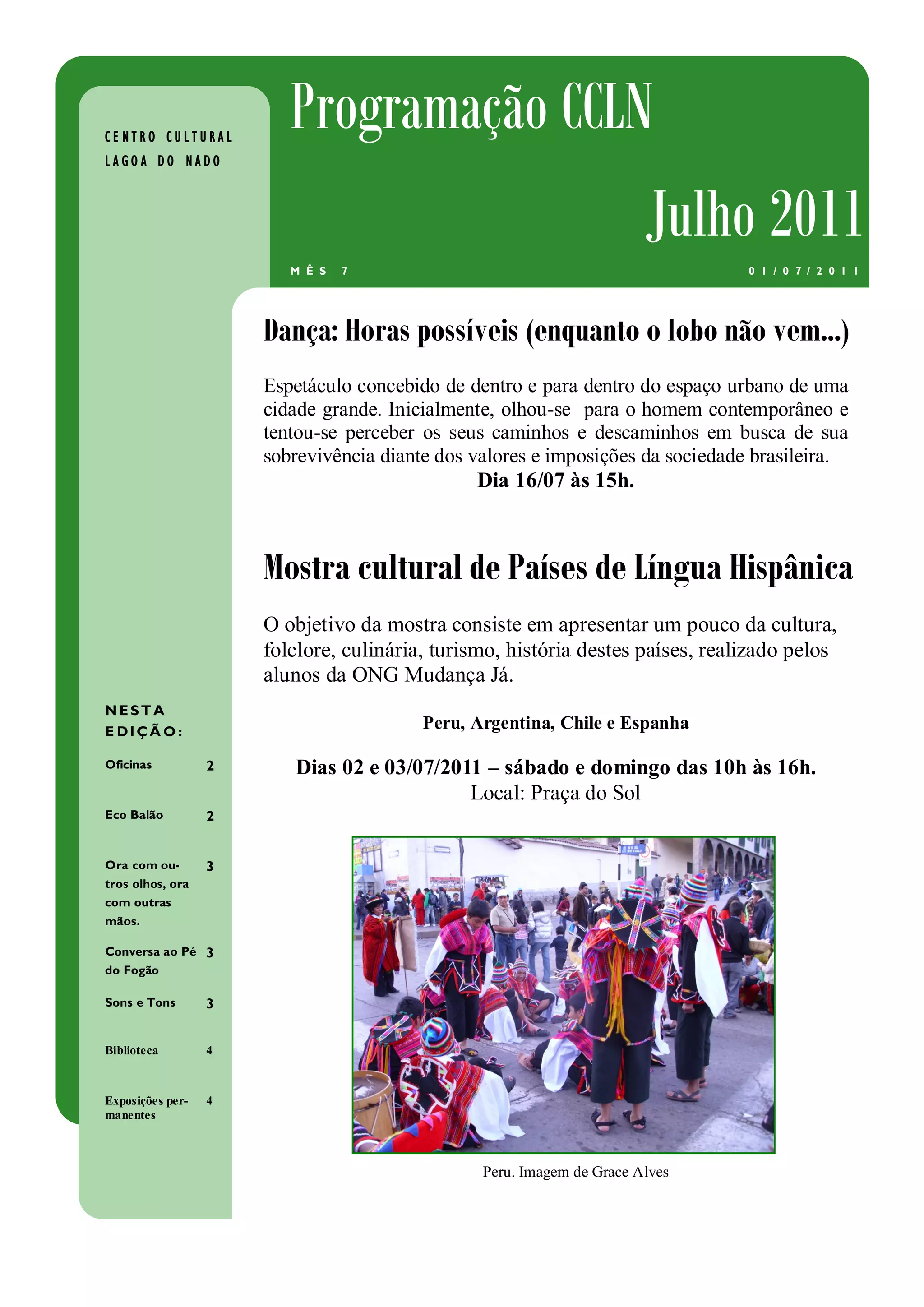 O documento apresenta a programação cultural do Centro Cultural Lagoa do Nado para o mês de julho de 2011, incluindo oficinas, apresentações musicais, exposições e eventos sobre dança, ioga, capoeira, jogos de tabuleiros e conversas.
