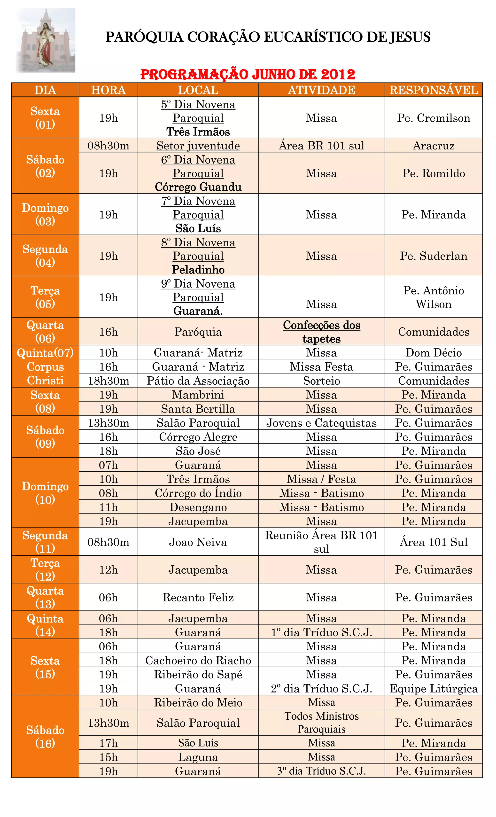O documento apresenta a programação de atividades da Paróquia Coração Eucarístico de Jesus ao longo do mês de junho, incluindo missas, festas, reuniões e encontros. As atividades ocorrerão em diversas localidades como Guaraná, Jacupemba, Aracruz e outras e serão lideradas por diferentes padres e equipes. O destaque é para o Tríduo de preparação para a Festa de São João Batista nos dias 15, 16 e 17 e a Assembleia Diocesana em Ibiraçu no dia