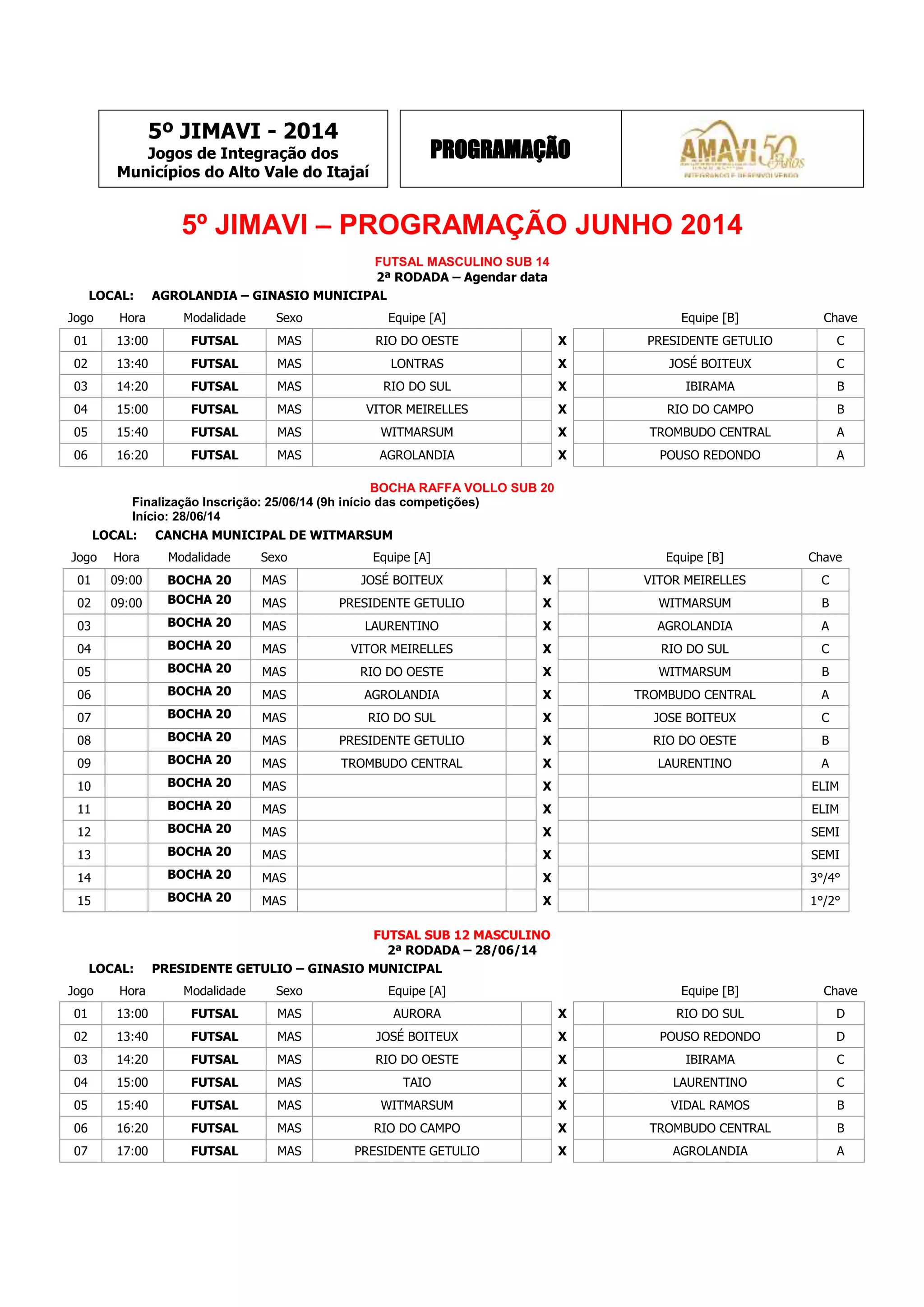 O documento apresenta a programação dos 5o Jogos de Integração dos Municípios do Alto Vale do Itajaí (JIMAVI), com a agenda de competições de futsal, vôlei, futebol e bocha para os meses de junho e julho de 2014, incluindo datas, locais e confrontos entre equipes de diferentes municípios.