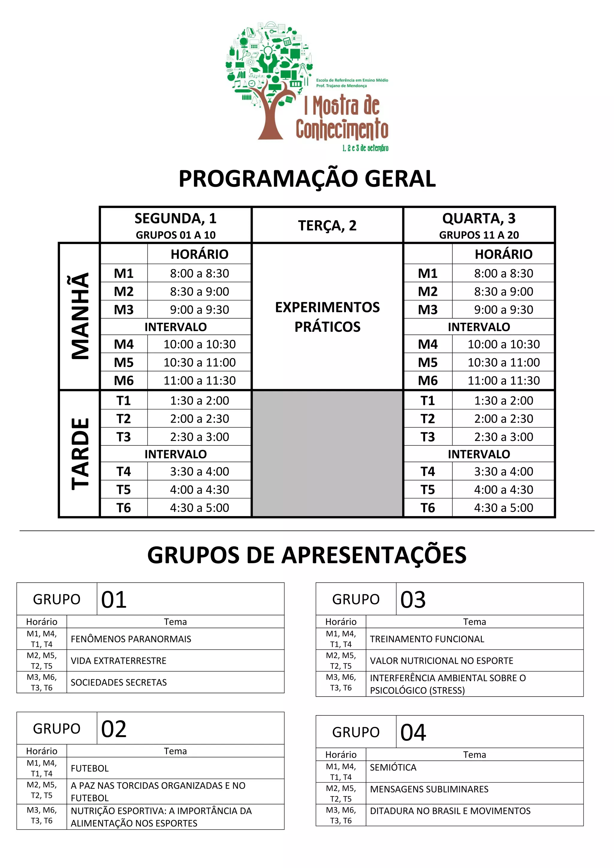 O documento apresenta a programação geral de experimentos práticos e apresentações de grupos divididos por temas. Os grupos 01 a 10 apresentarão na segunda-feira e os grupos 11 a 20 na quarta-feira, com horários distribuídos entre a manhã e a tarde. Os experimentos práticos ocorrerão conforme cronograma e temas listados.
