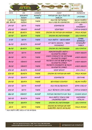 Cronograma de cursos de artesanato oferecidos pela Ciadas Artes em outubro, com datas, horários e professores. As aulas incluem pintura em tela, scrapbooking, cartonagem, pintura em madeira e uso de máquina Silhouette Cameo. Algumas aulas são gratuitas e a instituição oferece entrega em domicílio.