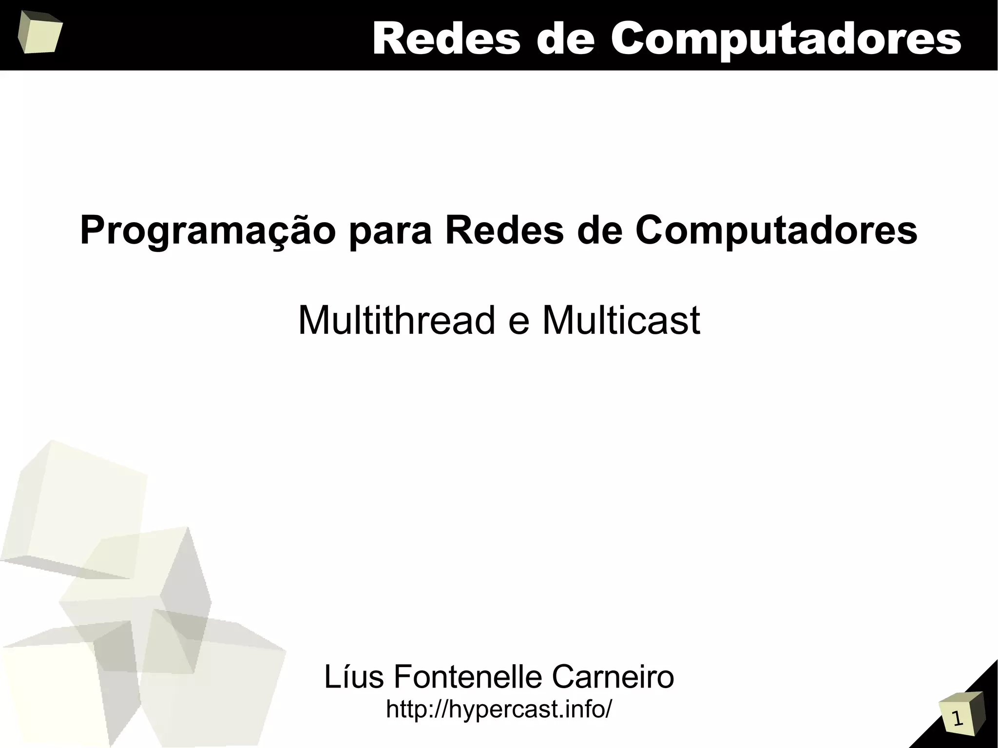 Este documento discute programação para redes de computadores, especificamente multithread e multicast. Aborda conceitos como comunicação com múltiplos clientes simultaneamente, servidores multithread e multicast, incluindo propagação de informações em datagramas IP e otimização do uso de links. Sugere projetos como um servidor web multithread simplificado e um chat multithread que aceite notificações do servidor.