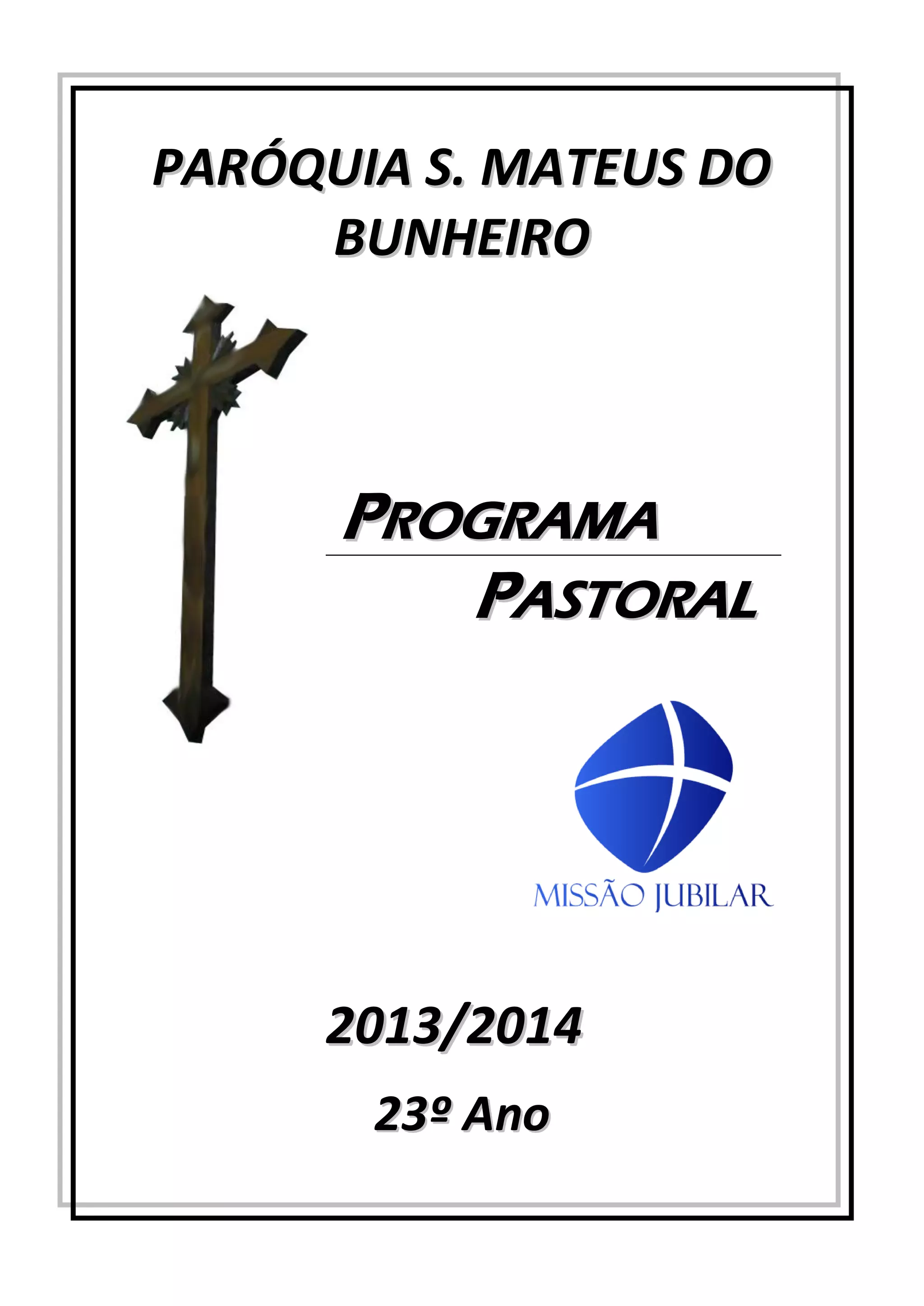 O documento apresenta o programa pastoral para 2013/2014 da Paróquia de São Mateus do Bunheiro. O objetivo geral é levar todo o povo da paróquia a descobrir e viver a reconciliação como dom de Deus até Julho de 2014. Inclui o calendário geral das ações ao longo do ano, com destaque para as ações de conjunto temáticas como a Festa das Colheitas, São Martinho, Ceias de Natal entre outras.