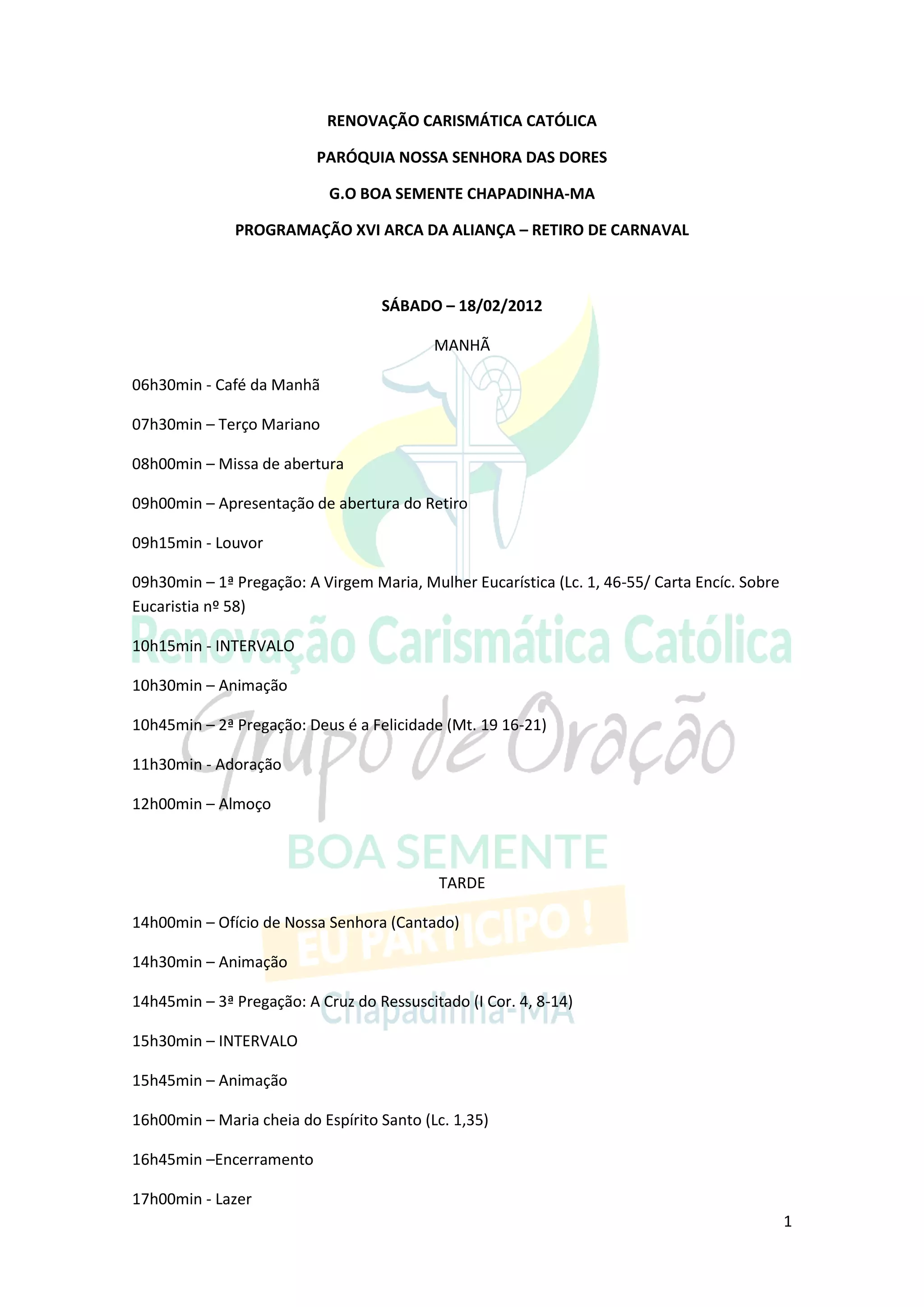 O documento apresenta a programação de um retiro de carnaval organizado pela Renovação Carismática Católica, com atividades como missas, pregações, adoração, lazer e shows durante os dias de sábado a terça-feira. Instruções pedem respeito aos horários, silêncio à noite, limpeza do local e conduta adequada nos banheiros e dormitórios.
