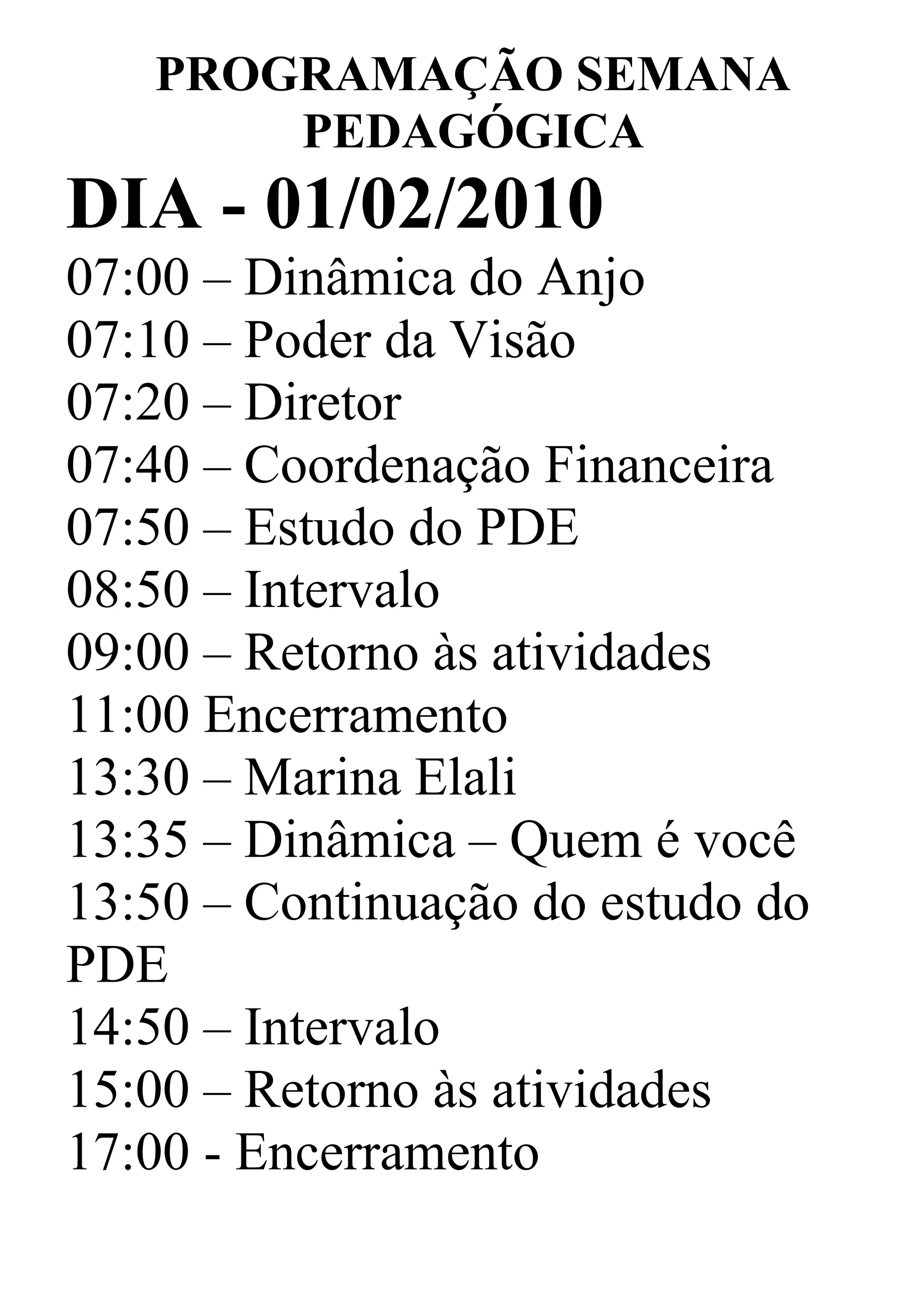 O documento apresenta a programação semanal pedagógica de três dias, com atividades como dinâmicas, palestras e estudos sobre o PDE, rendimentos, ensino noturno diferenciado e inclusão/avaliação.
