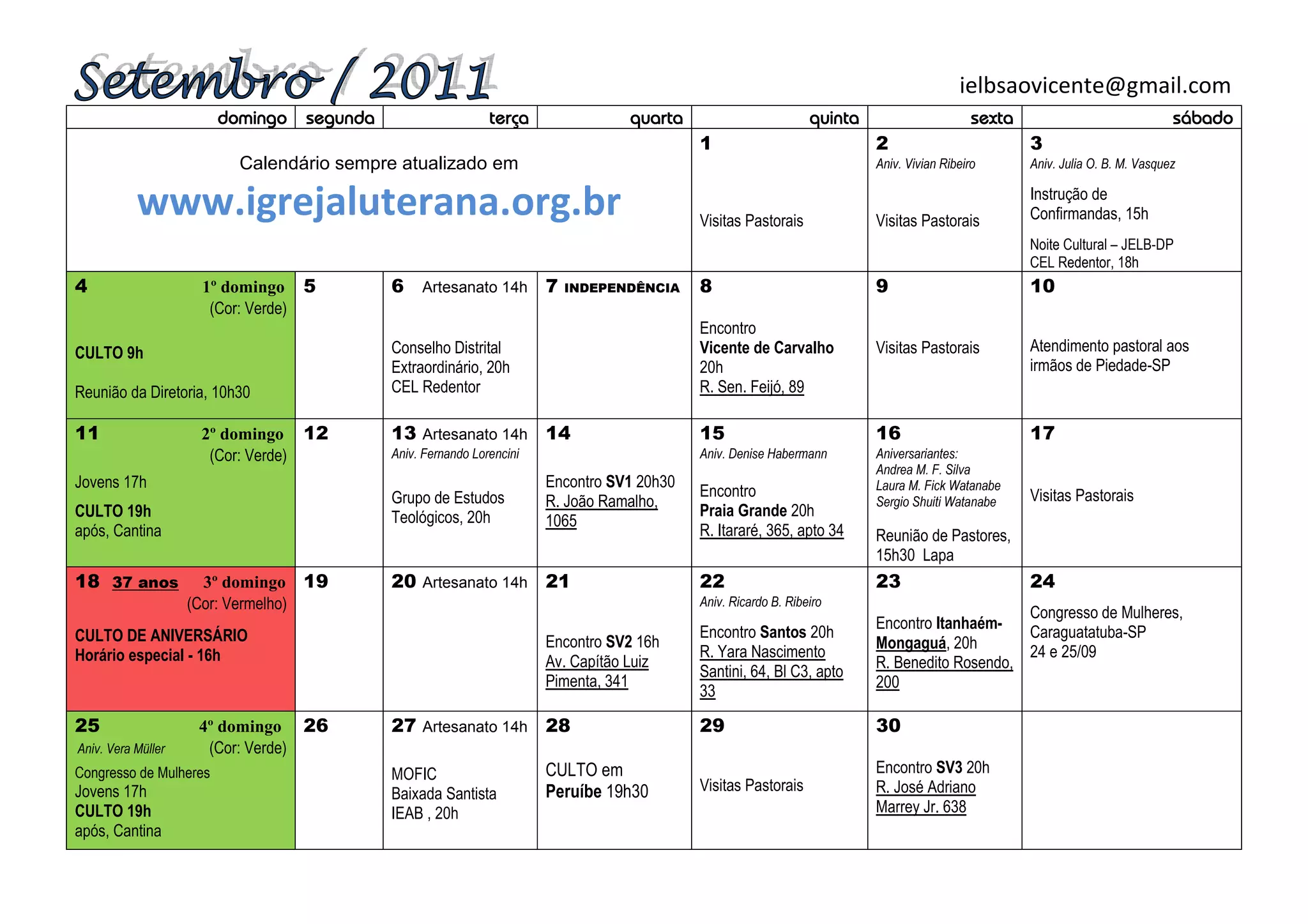 O documento é um calendário de atividades da Igreja Luterana para o mês de setembro. Ele inclui datas comemorativas, cultos, encontros, visitas pastorais e reuniões. Há também indicação de cores para os cultos dominicais e eventos como Congresso de Mulheres, Instrução de Confirmandas e Noite Cultural.