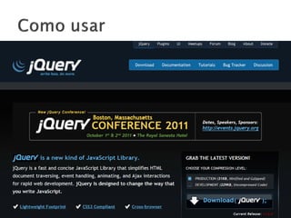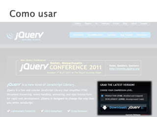 O documento fornece um guia abrangente sobre o uso de jQuery, incluindo conceitos básicos como manipulação do DOM, eventos e efeitos. Destaca a simplicidade da biblioteca, que busca facilitar a escrita de JavaScript e aborda diferentes funcionalidades, como seleção de elementos, eventos de mouse e teclado, e manipulação de propriedades de estilo. Além disso, apresenta exemplos práticos de implementação e técnicas para melhorar a experiência do desenvolvedor.