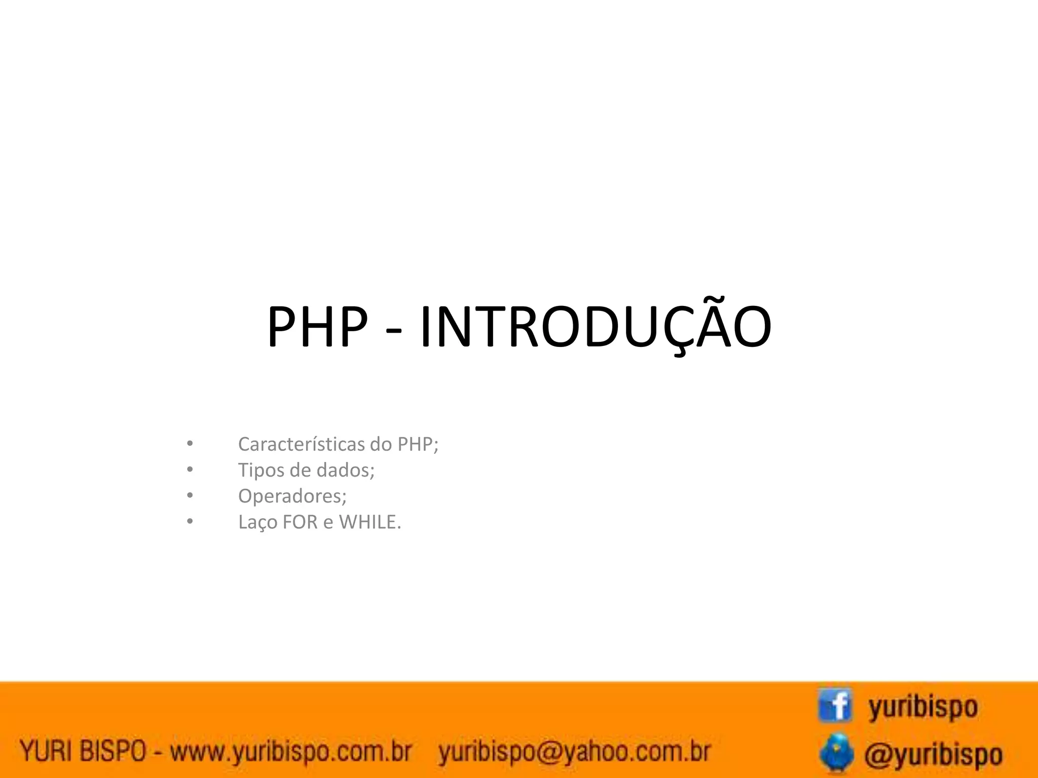 O documento discute características e conceitos básicos da linguagem PHP, incluindo tipos de dados, operadores, estruturas de controle de fluxo como laços for e while, e variáveis superglobais.