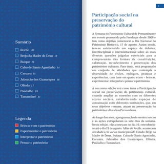 Este documento descreve as atividades da Semana do Patrimônio Cultural de Pernambuco em 2018, que inclui seminários, oficinas, exposições e apresentações com foco na participação social na preservação do patrimônio cultural. O evento ocorrerá entre os dias 10 e 21 de agosto em vários municípios de Pernambuco, com programação variada abordando temas como maracatus, patrimônio ferroviário, literatura de cordel e novos métodos para preservação do patrimônio histórico