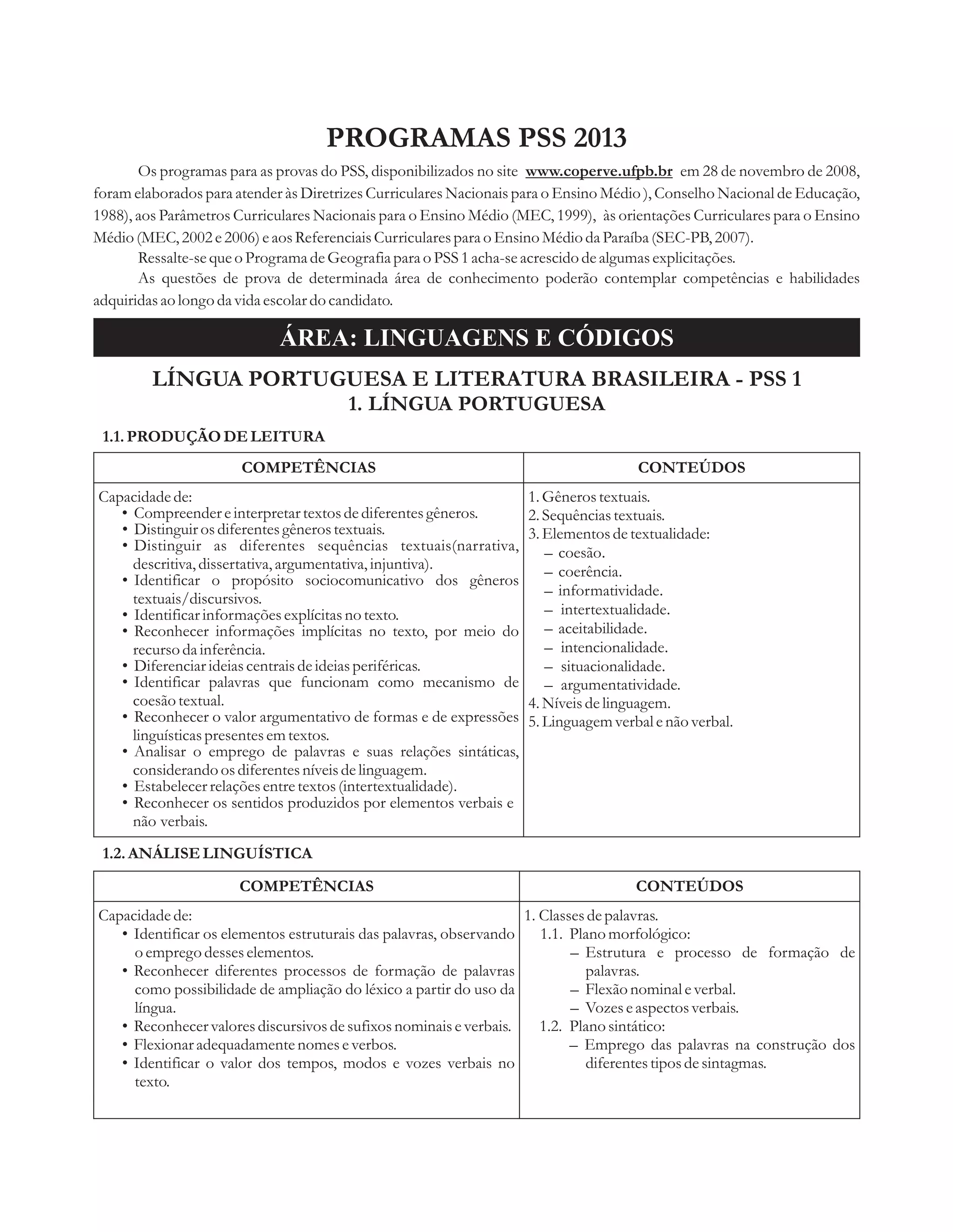 O documento apresenta os programas para as provas do PSS 2013, que foram elaborados de acordo com diretrizes curriculares nacionais e parâmetros curriculares para o ensino médio. São descritas as competências e conteúdos das provas de língua portuguesa, literatura brasileira, língua inglesa, língua francesa, língua espanhola e geografia geral e do Brasil.