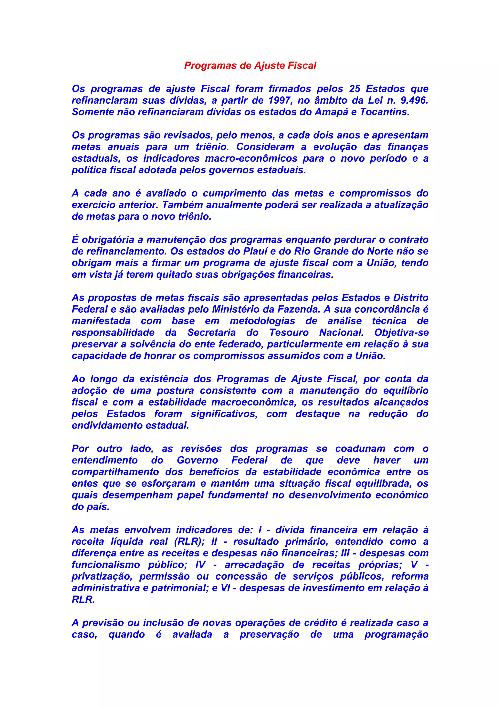 Os programas de ajuste fiscal foram firmados por 25 estados para refinanciar suas dívidas a partir de 1997. Eles são revisados a cada dois anos e definem metas fiscais trienais considerando indicadores econômicos e a política fiscal dos estados. Os programas ajudaram os estados a reduzirem seu endividamento de forma significativa.