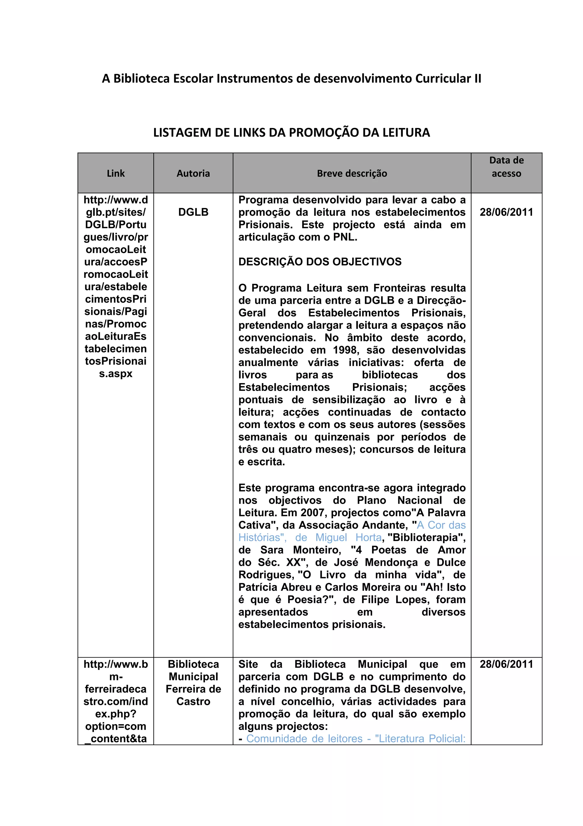 Este documento lista links de sites que promovem a leitura em Portugal. Inclui links para programas de promoção da leitura em prisões e bibliotecas municipais, assim como para a Fundação Calouste Gulbenkian, que oferece recursos para incentivar a leitura desde a mais tenra idade.