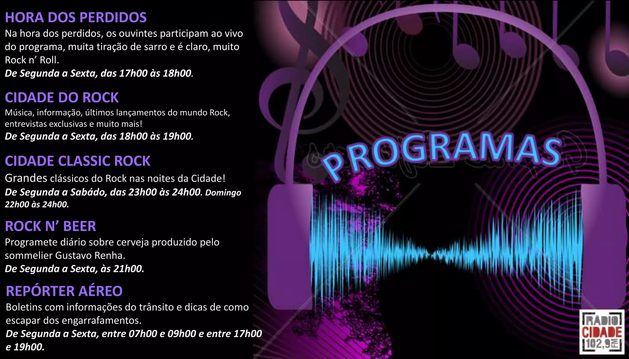 Este documento lista os programas de rádio da emissora Rádio Cidade, incluindo programas musicais como Hora dos Perdidos, Cidade do Rock e Cidade Classic Rock, programas informativos como Repórter Aéreo e Hora Certa, e programas especiais como Invasão da Cidade e A Vez do Brasil.