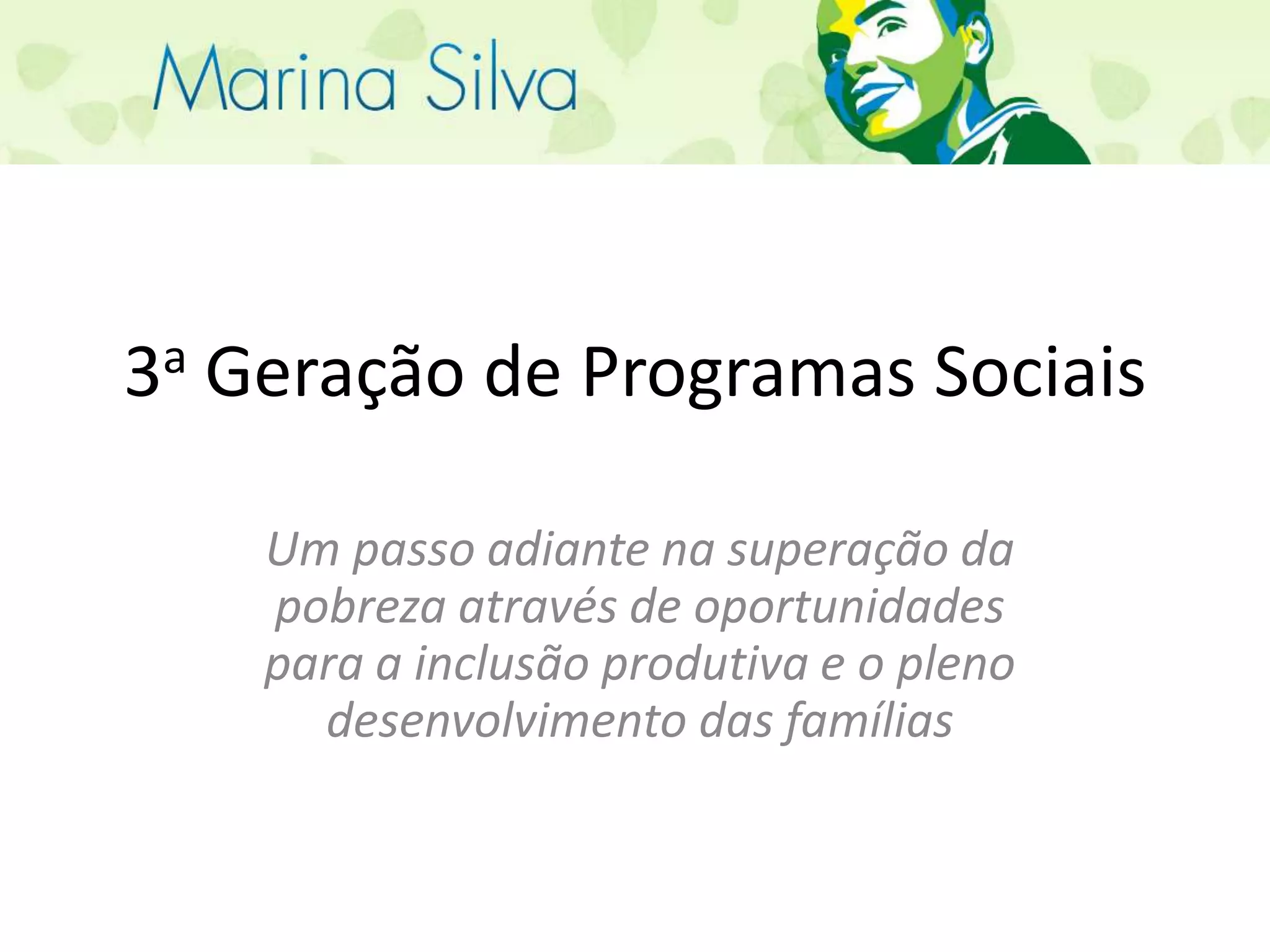 O documento descreve a proposta para uma 3a geração de programas sociais no Brasil. Ela inclui a expansão e aprimoramento do Cadastro Único para identificar as necessidades e potencialidades das famílias, a criação de uma Rede de Agentes de Desenvolvimento Familiar para fornecer serviços customizados às famílias, e um Sistema Integrado de Programas Sociais para oferecer uma cesta de oportunidades às famílias de acordo com seus planos de desenvolvimento.