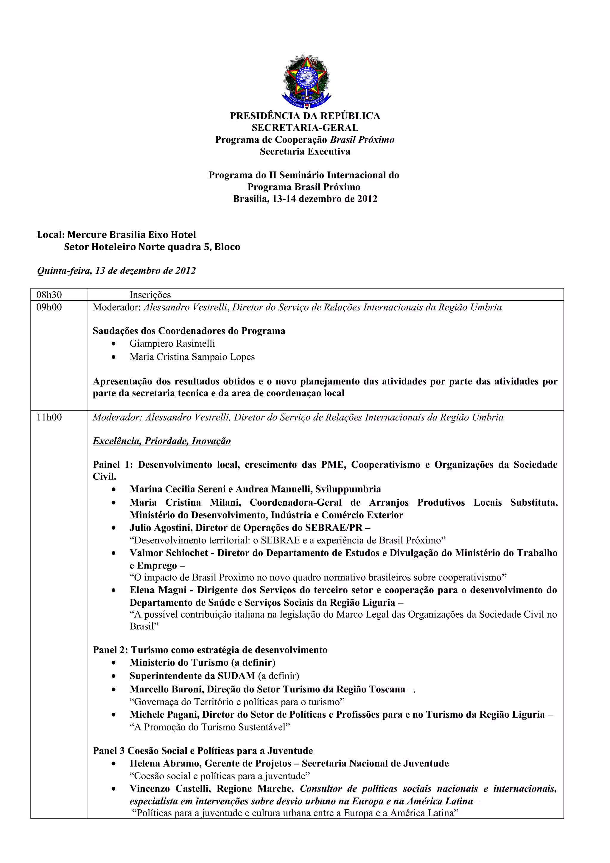 O documento descreve a agenda de um seminário internacional sobre o Programa Brasil Próximo realizado em Brasília em 13 e 14 de dezembro de 2012. O seminário contou com painéis sobre desenvolvimento local, turismo, juventude e cooperação entre Brasil e Itália. Também incluiu apresentações de projetos territoriais brasileiros e grupos de trabalho para discutir iniciativas em diferentes estados. O objetivo era avaliar resultados e planejar novas atividades do programa de cooperação.