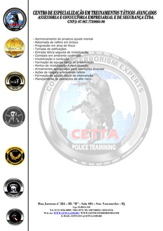 O documento descreve um curso de operações especiais em áreas de crise que ensina técnicas táticas avançadas para policiais e militares lidarem com situações de alto risco. O curso ensina entrada em edifícios, favelas e outras construções, resgate de reféns, combate em ambientes confinados e planejamento de operações complexas. Os instrutores têm experiência prática lidando com essas situações diariamente.