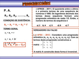 O documento apresenta definições e propriedades sobre progressões aritméticas, incluindo a fórmula para o termo geral e a soma dos termos de uma P.A. Há também questões sobre P.A. para serem classificadas como verdadeiras ou falsas e outras questões para serem respondidas.