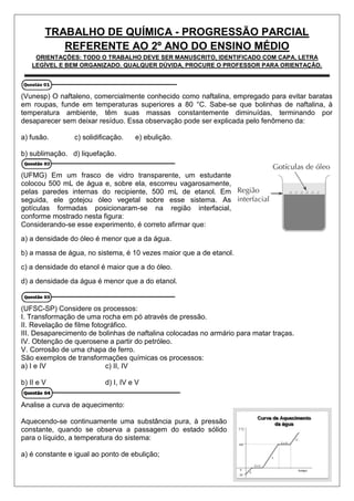 O documento fornece orientações para a realização de um trabalho de química do 2o ano do ensino médio, incluindo questões sobre naftaleno, etanol, água e óleo vegetal, reações químicas e propriedades de substâncias como cloreto de potássio e nitrato de potássio.