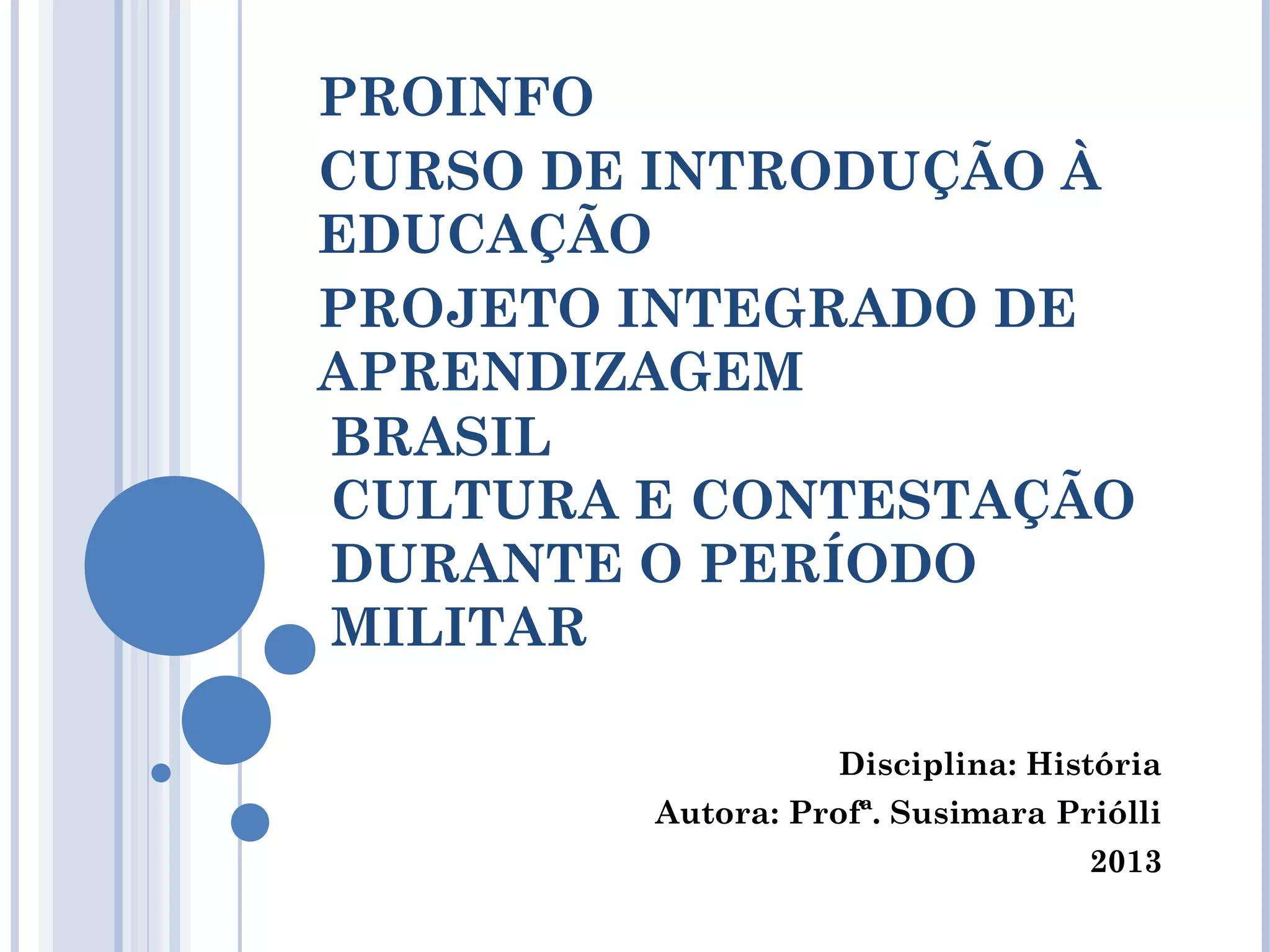 Este documento apresenta um projeto de ensino sobre a cultura e os movimentos de contestação durante o período militar no Brasil. O projeto abrange a história política e cultural dos anos 1960, com foco nos movimentos estudantil, feminista, hippie e tropicália. Os alunos serão divididos em grupos para pesquisar esses temas e apresentá-los em seminários com PowerPoint.