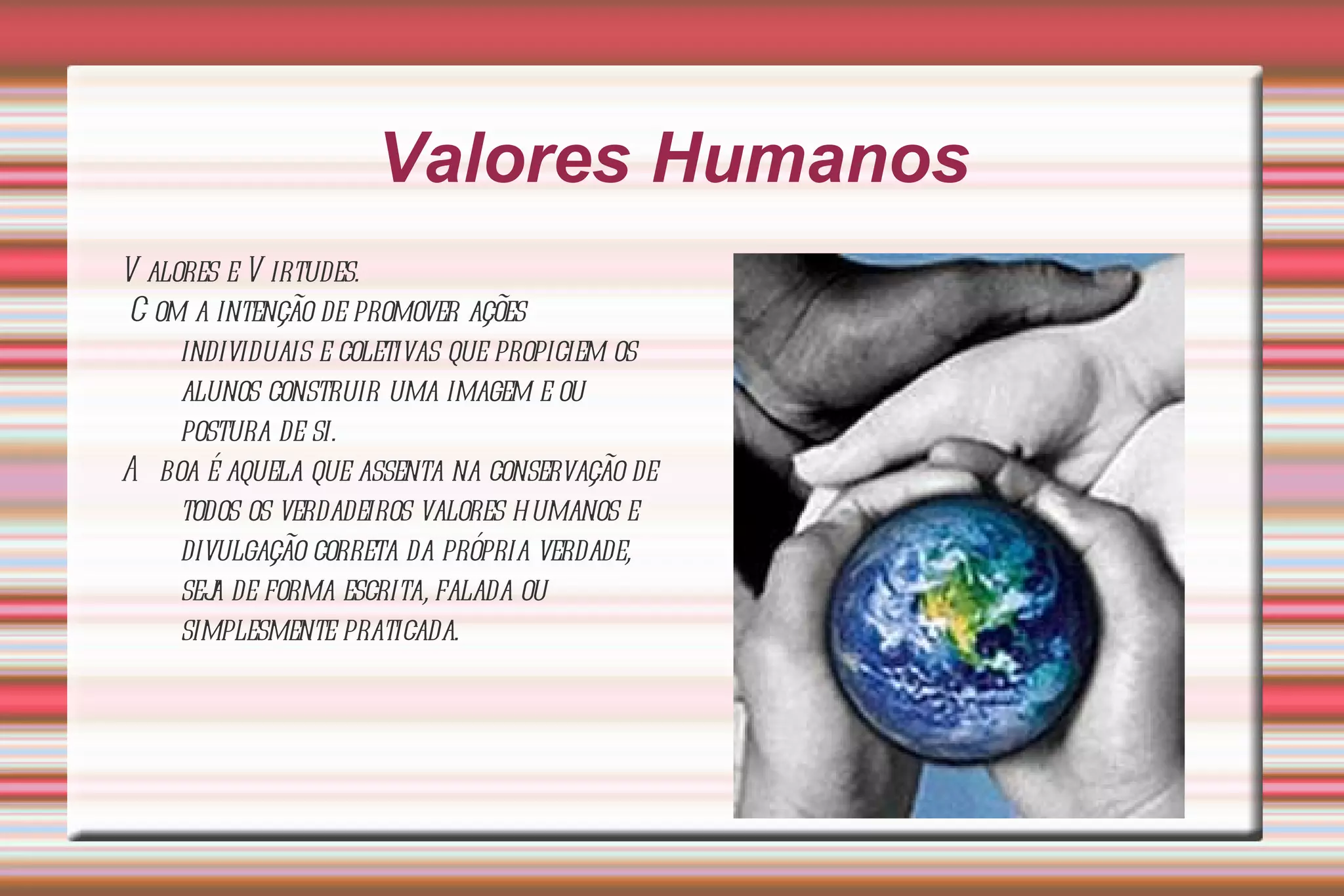 O documento discute a promoção de valores humanos entre os alunos por meio de ações individuais e coletivas. Ele define valores humanos como fundamentos morais e espirituais e justifica a necessidade de ensinar esses valores para o desenvolvimento integral dos alunos e da sociedade. O documento também lista objetivos e procedimentos para trabalhar valores como respeito, disciplina e convivência harmoniosa por meio de atividades como rodas de conversa e produção de textos.
