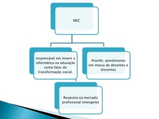 O documento discute a história da inserção da tecnologia na educação brasileira desde a década de 1970, com vários projetos nacionais e estaduais implementados para este fim, culminando no projeto UCA de distribuição de computadores para alunos a partir de 2010.