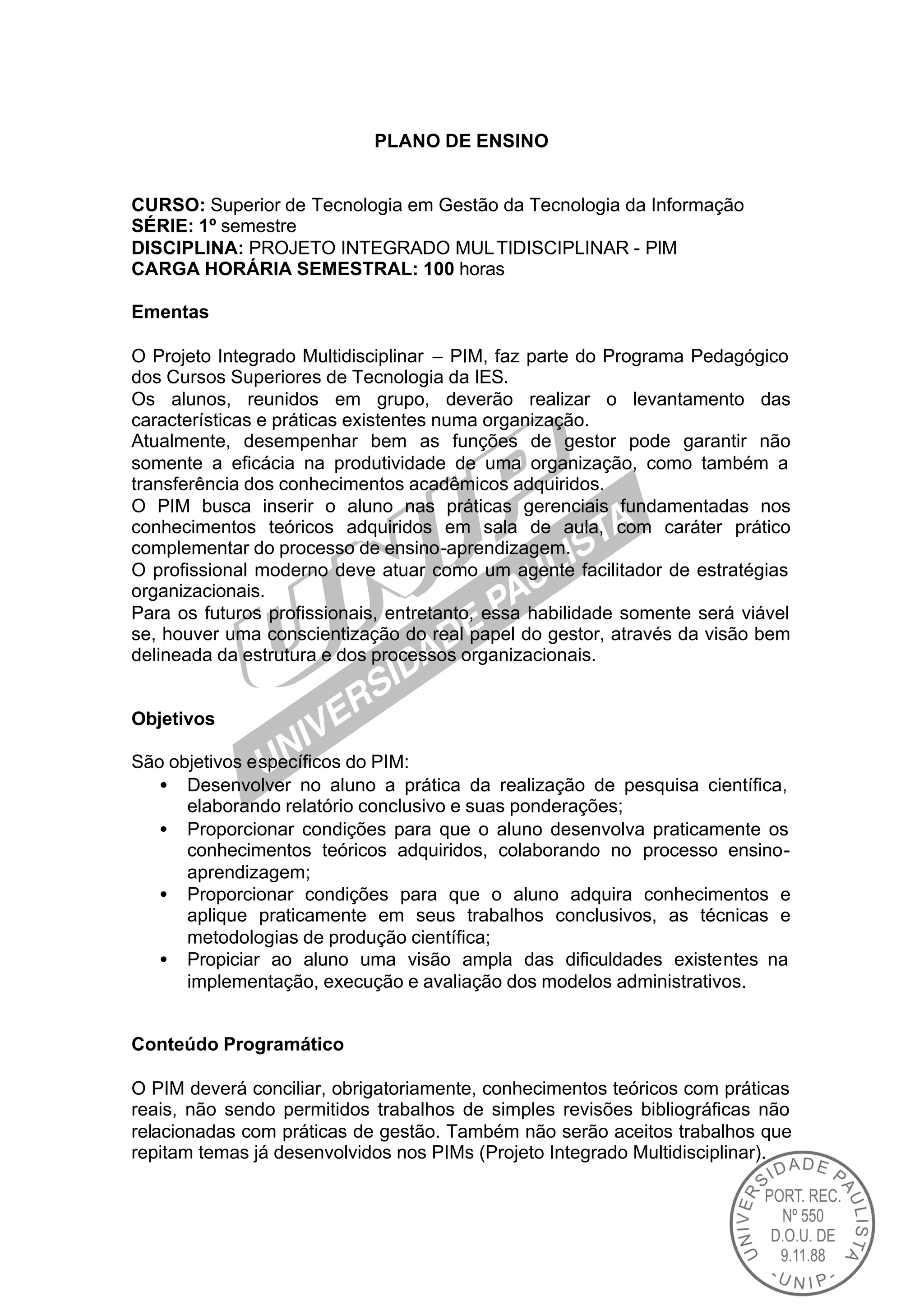 O documento descreve o Projeto Integrado Multidisciplinar (PIM) de um curso superior de tecnologia em gestão da tecnologia da informação. O PIM tem como objetivo inserir os alunos em práticas gerenciais baseadas nos conhecimentos teóricos adquiridos em sala de aula. Os alunos devem realizar pesquisas em grupo sobre organizações e produzir relatórios finais. O documento detalha os objetivos, conteúdos, estratégias de ensino e avaliação do PIM.