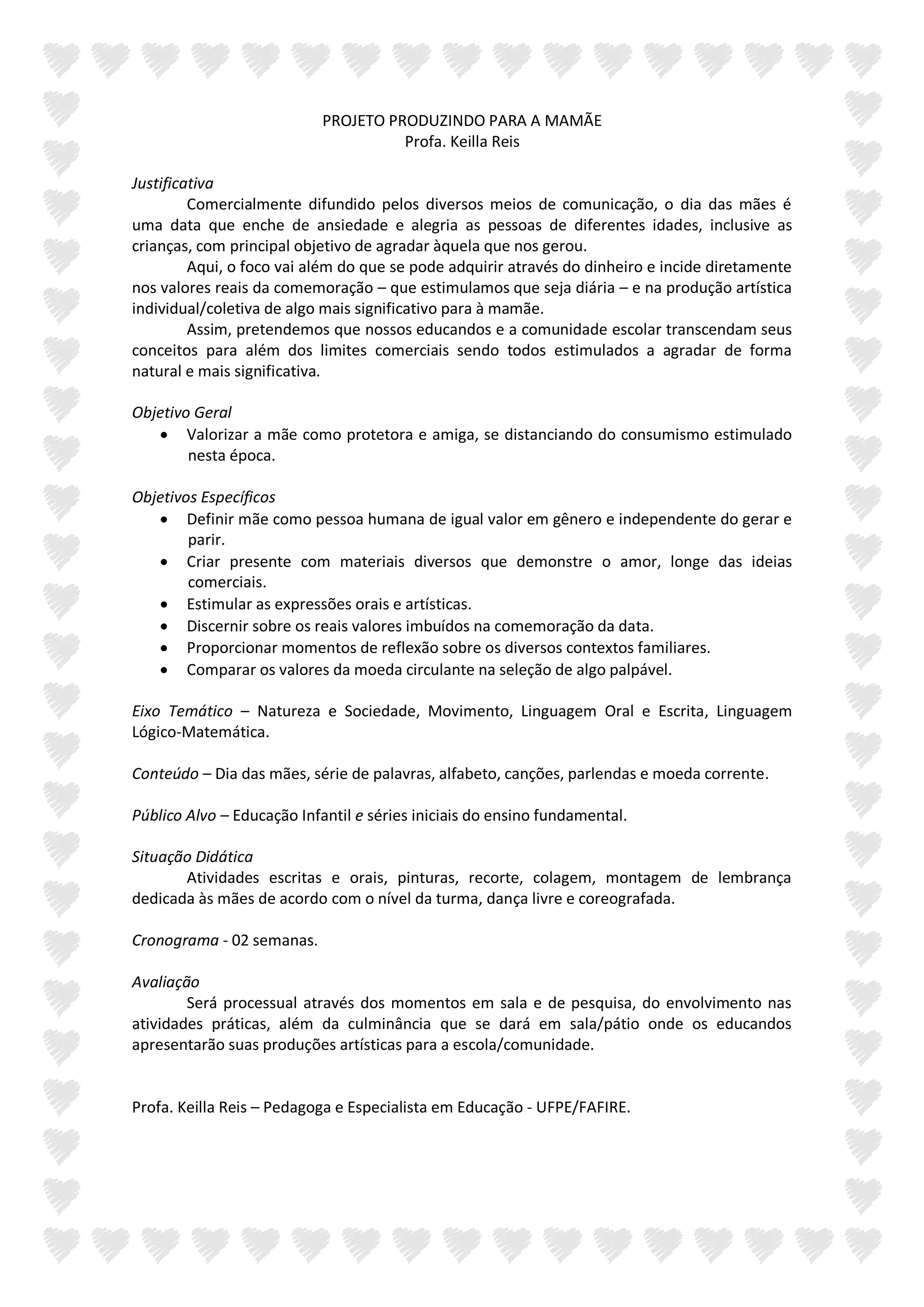 Este documento descreve um projeto para o Dia das Mães que encoraja as crianças a produzirem presentes significativos para suas mães, longe do consumismo. O objetivo é valorizar as mães como protetoras e amigas através de atividades artísticas como pintura, dança e música, ao invés de presentes comprados. As crianças terão duas semanas para criar e apresentar suas produções para a escola.