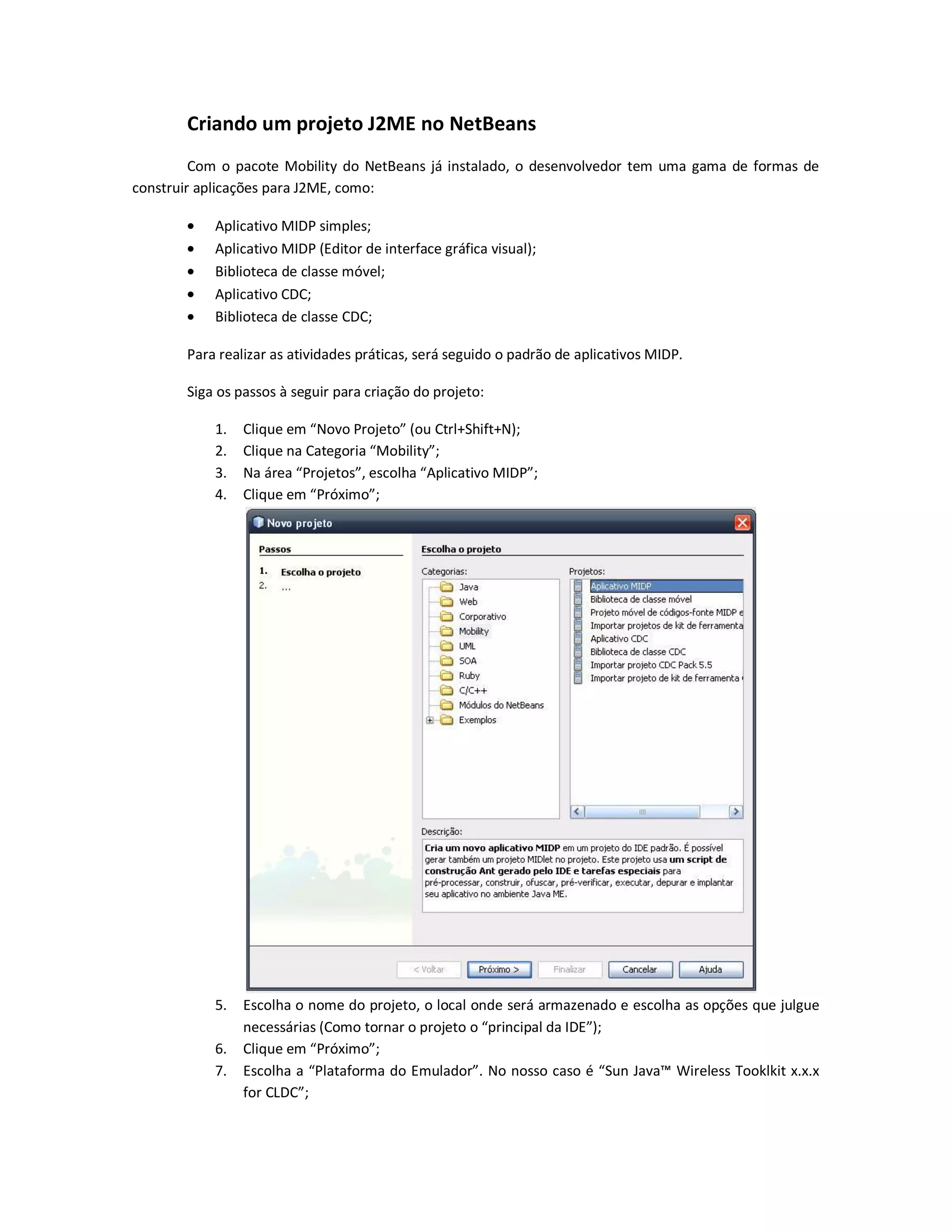O documento fornece instruções passo-a-passo para criar um projeto J2ME no NetBeans, começando com a seleção de um tipo de projeto MIDP, inserção de detalhes do projeto, seleção de uma plataforma e dispositivo de emulador, e conclusão do projeto.