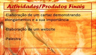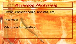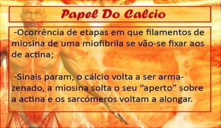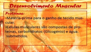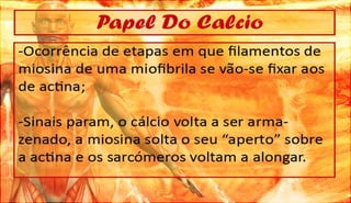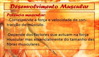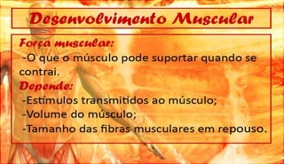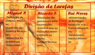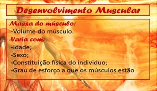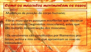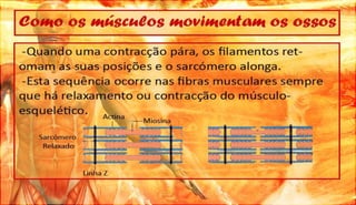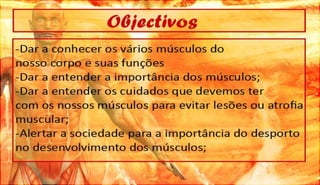 O documento discute a definição, controle e tipos de músculos, como eles se relacionam com a locomoção, esportes e lesões musculares. Ele também aborda esteróides, desenvolvimento muscular e como os músculos movem os ossos, fornecendo referências bibliográficas no final.