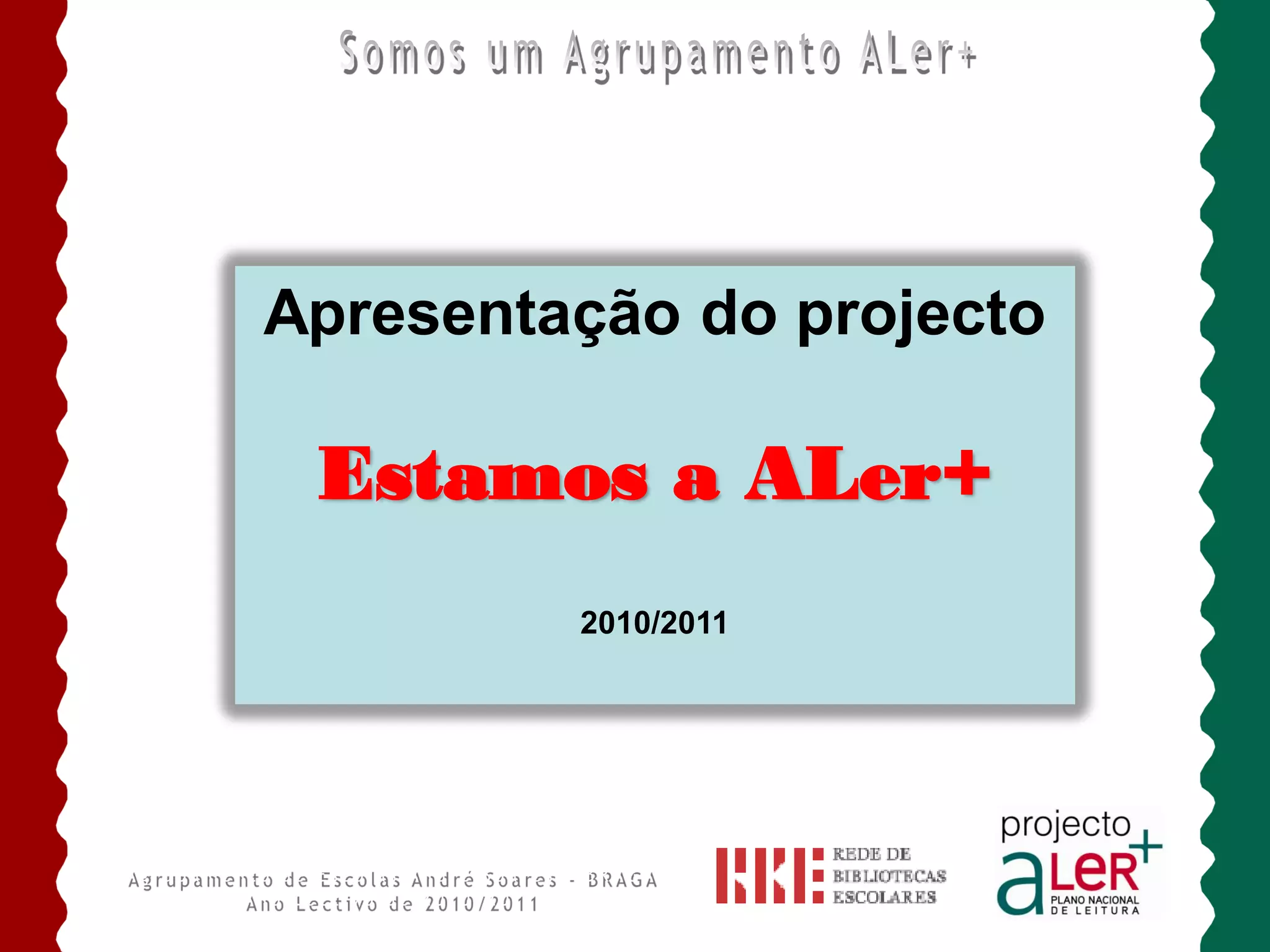 Este documento apresenta o projeto ALer+ para o ano letivo de 2010/2011. O projeto envolve várias escolas e tem como objetivos promover a leitura entre alunos, professores e a comunidade através de diversas atividades como doação de livros, exposições temáticas, encontros com escritores e seminários. O projeto procura desenvolver literacias e envolver parceiros como associações de pais, bibliotecas e editoras.