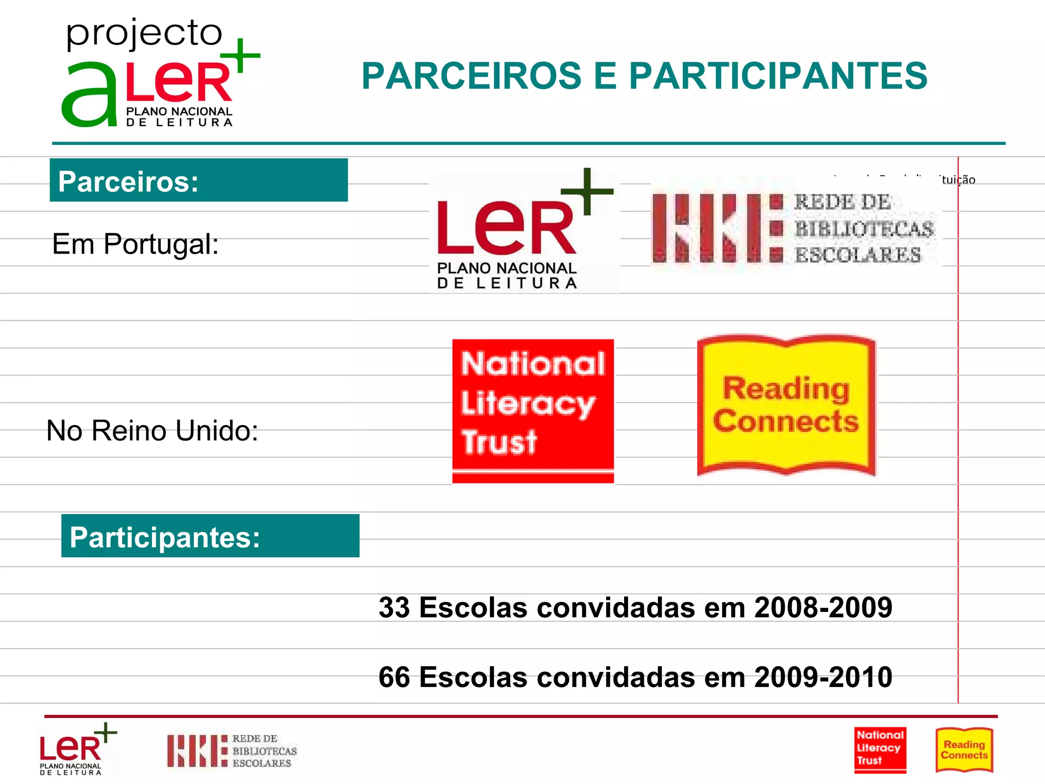 Este documento descreve o projeto "Ler e Recriar +" que promove a leitura em escolas portuguesas e britânicas. O projeto convidou 33 escolas portuguesas em 2008-2009 e 66 em 2009-2010. O objetivo é desenvolver uma cultura de leitura nas escolas envolvendo a comunidade escolar e as famílias através de estratégias, materiais de apoio e incidência em áreas como a biblioteca e promoção da leitura.