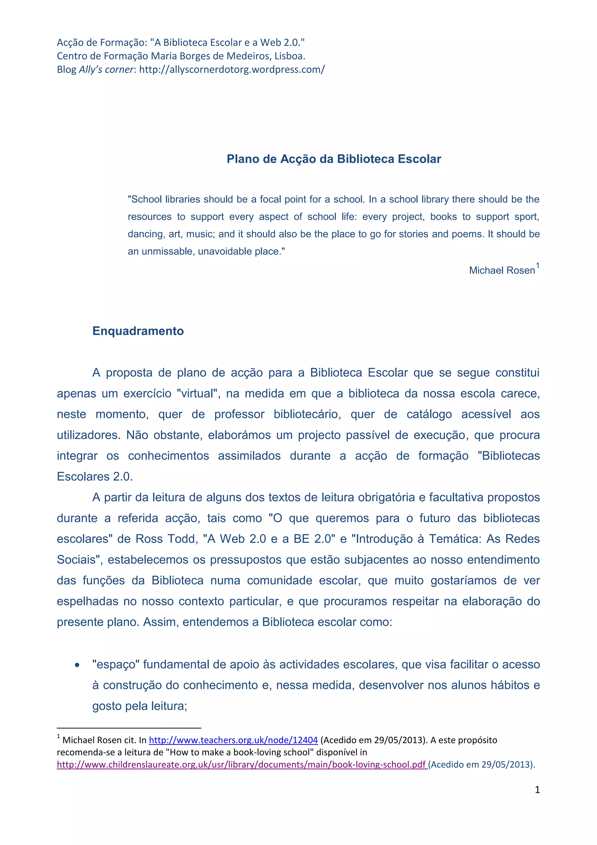 Este documento descreve um plano de ação para a biblioteca escolar que inclui: