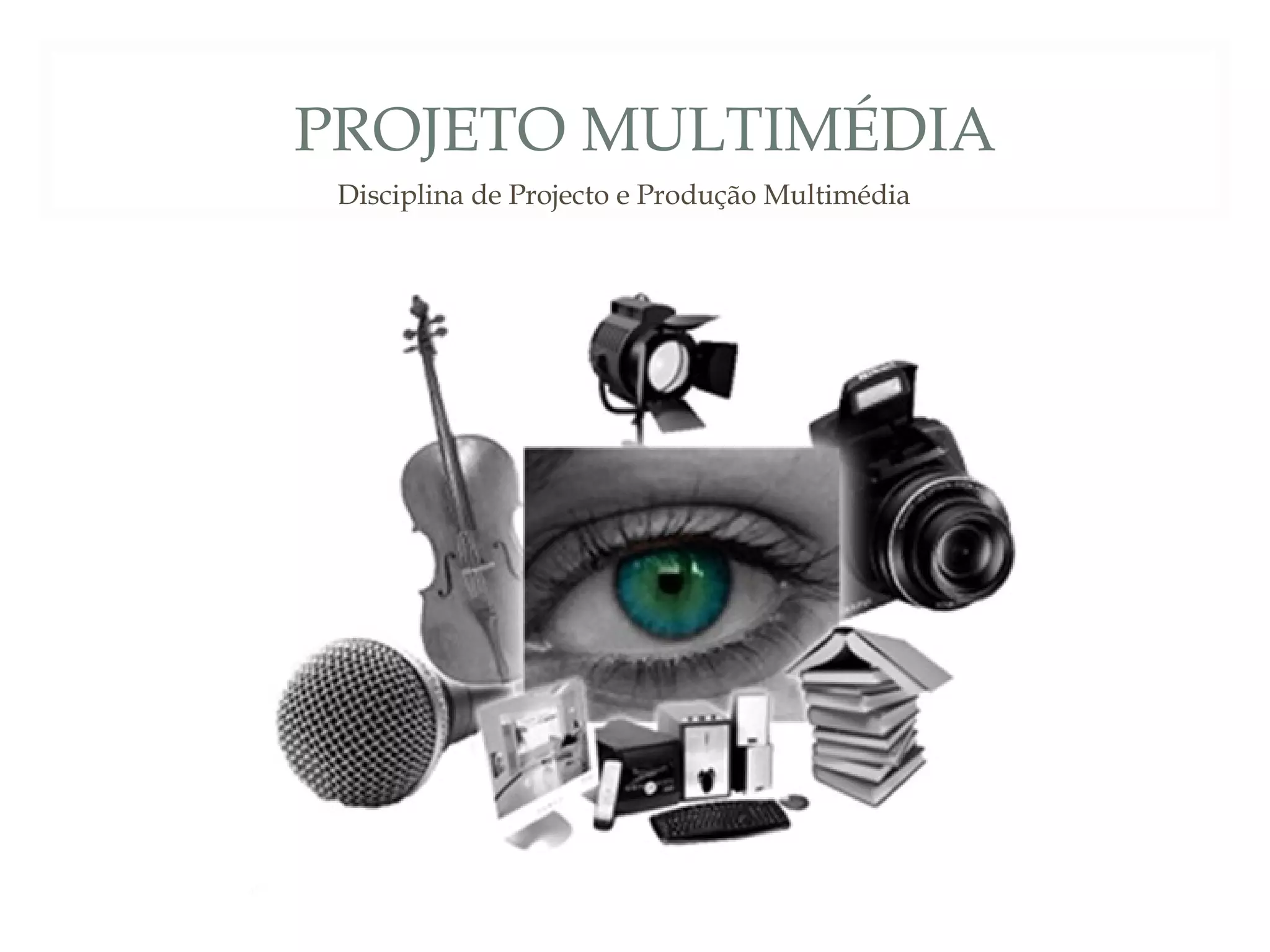 O documento discute os principais aspectos de um projeto multimédia, incluindo planeamento, design e gestão do projeto. Aborda tópicos como análise e planeamento, design da estrutura e ecrãs, e tipos de interfaces. Inclui exemplos de diagramas como Gantt e PERT para gestão de projetos, assim como storyboards para design de ecrãs.